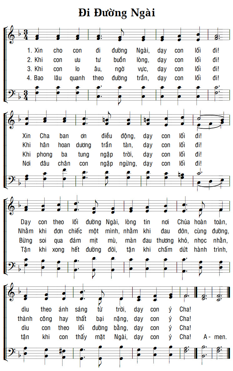1. Xin cho con đi đường Ngài, dạy con lối đi! Xin Cha ban ơn điều động, dạy con lối đi! Dạy con theo lối đường Ngài, lòng tin nơi Chúa hoàn toàn, dìu theo ánh sáng từ trời, dạy con ý Cha! 2. Khi con ưu tư buồn lòng, dạy con lối đi! Khi hân hoan dương trần tàn, dạy con lối đi! Nhằm khi đơn chiếc một mình, nhằm khi đau đớn, cùng đường, thành công hay thất bại nặng, dạy con ý Cha! 3. Khi con lo âu, ngờ vực, dạy con lối đi! Khi phong ba tung ngập trời, dạy con lối đi! Bừng soi qua đám mịt mù, màn đau thương khó, nhọc nhằn, dìu con theo lối đường bằng, dạy con ý Cha! 4. Bao lâu quanh theo đường trần, dạy con lối đi! Nơi đâu chân con ngập ngừng, dạy con lối đi! Tận khi xong hết đường đời, tận khi chấm dứt hành trình, tận khi con thấy mặt Ngài, dạy con ý Cha! A-men.