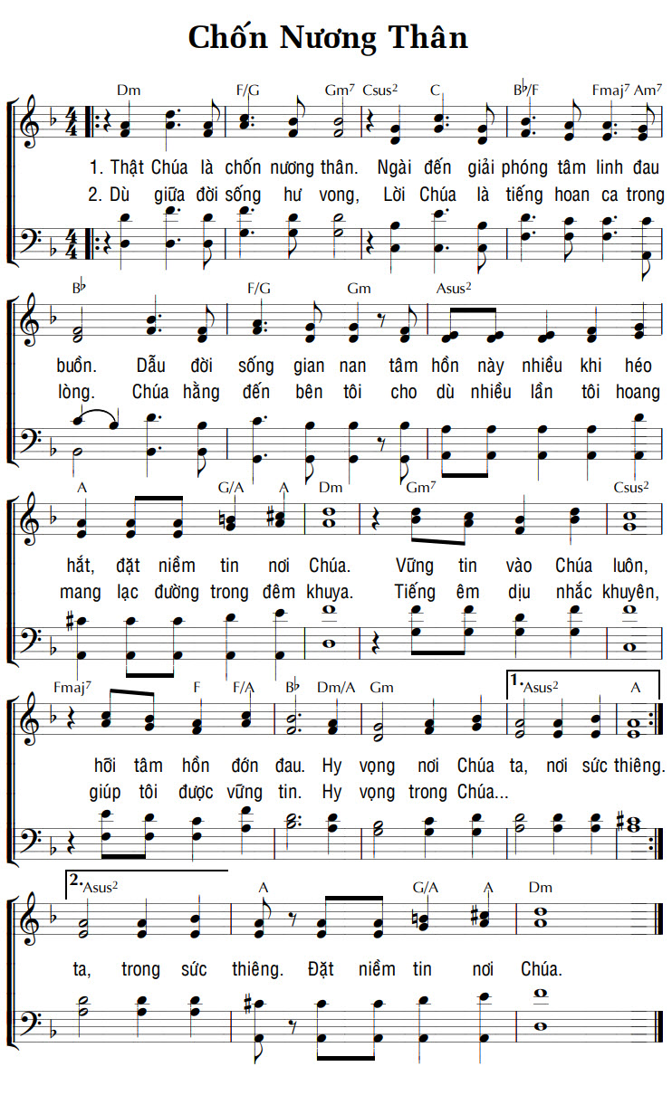 1. Thật Chúa là chốn nương thân. Ngài đến giải phóng tâm linh đau buồn. Dẫu đời sống gian nan tâm hồn này nhiều khi héo hắt, đặt niềm tin nơi Chúa. Vững tin vào Chúa luôn, hối tâm hồn đớn đau. Hy vọng nơi Chúa ta, nơi sức thiêng. 2. Dù giữa đời sống hư vong, Lời Chúa là tiếng hoan ca trong lòng. Chúa hằng đến bên tôi cho dù nhiều lần tôi hoang mang lạc đường trong đêm khuya. Tiếng êm dịu nhắc khuyên, giúp tôi được vững tin. Hy vọng trong Chúa... ta, trong sức thiêng. Đặt niềm tin nơi Chúa.