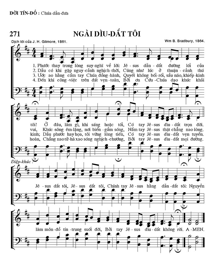 1. Phước thay trong lòng suy nghĩ về lời: Jê-sus dẫn-dắt đường lối của tôi! Ở đâu, làm gì, khi sáng hoặc tối, Có tay Jê-sus dìu-dắt trọn đời. 2. Dẫu có khi gặp nguy-cảnh nghịch-thời, Cũng như lúc ở thuận-cảnh thú vui, Khúc sông êm lặng, nơi biển-gầm sóng, Nắm tay Jê-sus thật chẳng nao lòng. 3. Ước ao hằng cầm tay Chúa đồng-hành, Quyết không bối-rối, sầu não, khiếp kinh; Dẫu phước hay họa, tôi vững lòng tiến, Có tay Jê-sus dìu-dắt vẹn tuyền. 4. Đến khi công-việc trên đất vẹn-toàn, Bởi ơn Cứu-Chúa dạo khúc khải hoàn, Chẳng nao tử-hà xao sóng nghịch-chương, Bởi tay Jê-sus dìu-dắt mọi đường. Điệp khúc: Jê-sus dắt tôi, Jê-sus dắt tôi, Chính tay Jê-sus hằng dẫn-dắt tôi: Nguyện làm môn-đồ tín-trung suốt đời, Bởi tay Jê-sus dìu-dắt không rời. A-MEN.