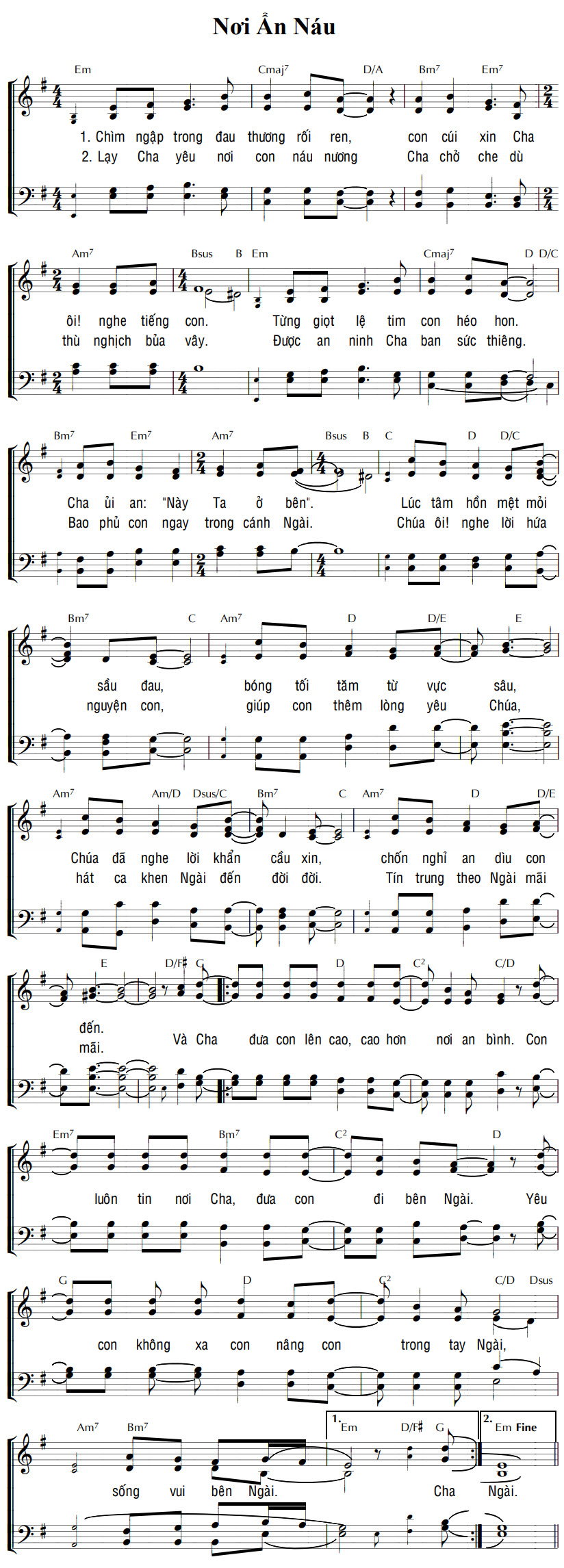 1. Chìm ngập trong đau thương rối ren, con cúi xin Cha ôi! nghe tiếng con. Từng giọt lệ tim con héo hon. Lúc tâm hồn mệt mỏi sầu đau, bóng tối tăm từ vực sâu, Chúa đã nghe lời khẩn cầu xin, chốn nghỉ an dìu con đến. Và Cha đưa con lên cao, cao hơn nơi an bình. Con luôn tin nơi Cha, đưa con đi bên Ngài. Yêu con không xa con nâng con trong tay Ngài, sống vui bên Ngài. Cha Ngài. 2. Lạy Cha yêu nơi con náu nương Cha chở che dù thù nghịch bủa vây. Được an ninh Cha ban sức thiêng. Chúa ôi! nghe lời hứa nguyện con, giúp con thêm lòng yêu Chúa, hát ca khen Ngài đến đời đời. Tín trung theo Ngài mãi mãi. Và Cha đưa con lên cao, cao hơn nơi an bình. Con luôn tin nơi Cha, đưa con đi bên Ngài. Yêu con không xa con nâng con trong tay Ngài, sống vui bên Ngài. Cha Ngài.
