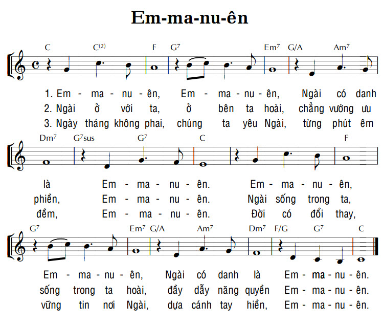 1. Em-ma-nu-ên, Em-ma-nu-ên, Ngài có danh là Em-ma-nu-ên. 2. Ngài ở với ta, ở bên ta hoài, chẳng vướng ưu phiền, Ngài sống trong ta, sống trong ta hoài, đầy dẫy năng quyền Em-ma-nu-ên. 3. Ngày tháng không phai, chúng ta yêu Ngài, từng phút êm đềm, Đời có đổi thay, vững tin nơi Ngài, dựa cánh tay hiền, Em-ma-nu-ên.