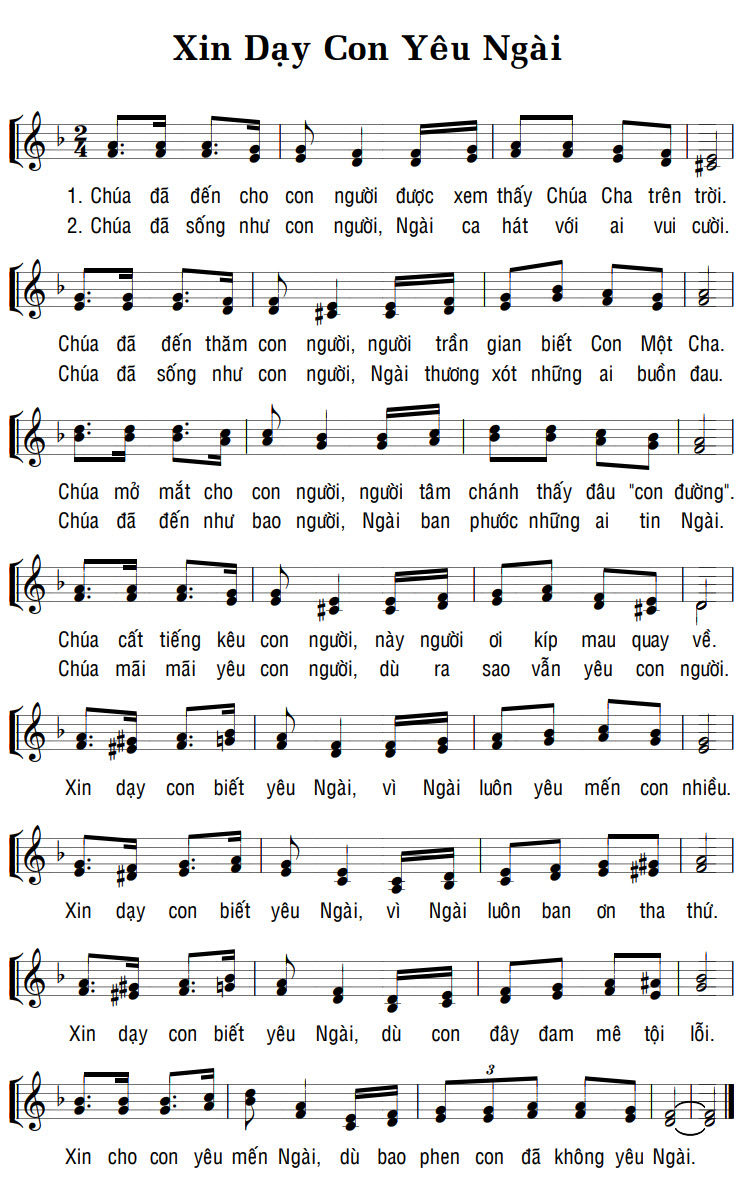 1. Chúa đã đến cho con người được xem thấy Chúa Cha trên trời. Chúa đã đến thăm con người, người trần gian biết Con Một Cha. Chúa mở mắt cho con người, người tâm chánh thấy đâu "con đường". Chúa cất tiếng kêu con người, này người ơi kíp mau quay về. 2. Chúa đã sống như con người, Ngài ca hát với ai vui cười. Chúa đã sống như con người, Ngài thương xót những ai buồn đau. Chúa đã đến như bao người, Ngài ban phước những ai tin Ngài. Chúa mãi mãi yêu con người, dù ra sao vẫn yêu con người. Điệp khúc: Xin dạy con biết yêu Ngài, vì Ngài luôn yêu mến con nhiều. Xin dạy con biết yêu Ngài, vì Ngài luôn ban ơn tha thứ. Xin dạy con biết yêu Ngài, dù con đây đam mê tội lỗi. Xin cho con yêu mến Ngài, dù bao phen con đã không yêu Ngài.