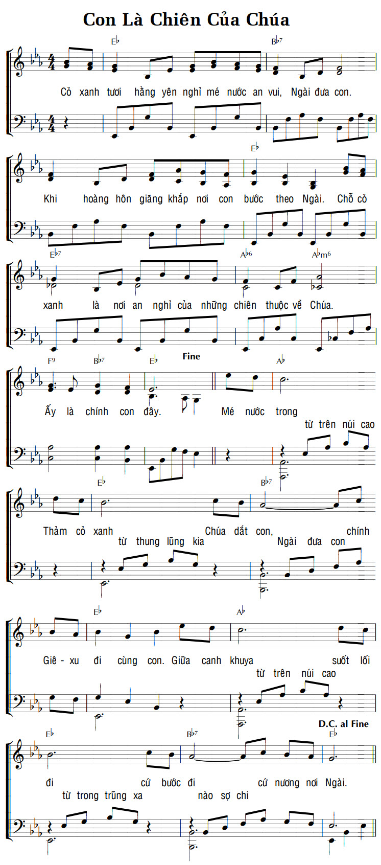 1. Cỏ xanh tươi hằng yên nghỉ mé nước an vui, Ngài đưa con. Khi hoàng hôn giăng khắp nơi con bước theo Ngài. Chỗ cỏ xanh là nơi an nghỉ của những chiên thuộc về Chúa. 2. Ấy là chính con đây. Mé nước trong từ trên núi cao. Thảm cỏ xanh từ thung lũng kia Chúa dắt con, Ngài đưa con chính Giê-xu đi cùng con. Giữa canh khuya từ trên núi cao suốt lối đi từ trong trũng xa nào sợ chi cứ bước đi cứ nương nơi Ngài. 3. Ấy là chính con đây. Mé nước trong từ trên núi cao. Thảm cỏ xanh từ thung lũng kia Chúa dắt con, Ngài đưa con chính Giê-xu đi cùng con. Giữa canh khuya từ trên núi cao suốt lối đi từ trong trũng xa nào sợ chi cứ bước đi cứ nương nơi Ngài.