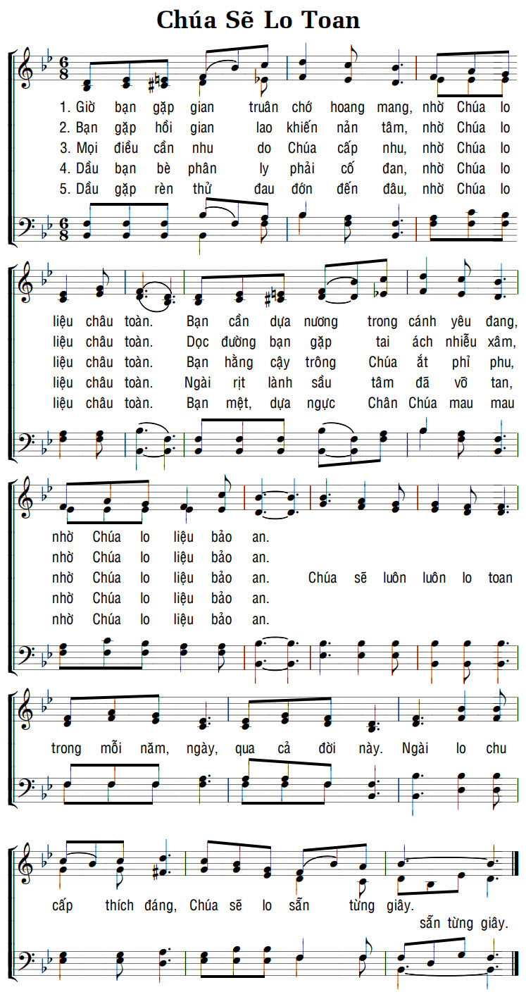 1. Giờ bạn gặp gian truân chốn hoang mang, nhờ Chúa lo liệu châu toàn. Bạn cần dựa nương trong cánh yêu đang, nhờ Chúa lo liệu bảo an. Chúa sẽ luôn luôn lo toan trong mỗi năm, ngày, qua cả đời này. Ngài lo chu cấp thích đáng, Chúa sẽ lo sẵn từng giây. 2. Bạn gặp hồi gian lao khiến nản tâm, nhờ Chúa lo liệu châu toàn. Dọc đường bạn gặp tai ách nhiều xâm, nhờ Chúa lo liệu bảo an. Chúa sẽ luôn luôn lo toan trong mỗi năm, ngày, qua cả đời này. Ngài lo chu cấp thích đáng, Chúa sẽ lo sẵn từng giây. 3. Mọi điều cần nhu do Chúa cấp nhu, nhờ Chúa lo liệu châu toàn. Bạn hằng cậy trông Chúa ắt phỉ phu, nhờ Chúa lo liệu bảo an. Chúa sẽ luôn luôn lo toan trong mỗi năm, ngày, qua cả đời này. Ngài lo chu cấp thích đáng, Chúa sẽ lo sẵn từng giây. 4. Dầu bạn bè phân ly phải cố đan, nhờ Chúa lo liệu châu toàn. Ngài rịt lành sầu tâm đã vô tan, nhờ Chúa lo liệu bảo an. Chúa sẽ luôn luôn lo toan trong mỗi năm, ngày, qua cả đời này. Ngài lo chu cấp thích đáng, Chúa sẽ lo sẵn từng giây. 5. Dầu gặp rèn thử đau đớn đến đâu, nhờ Chúa lo liệu châu toàn. Bạn mệt, dựa ngực Chân Chúa mau mau, nhờ Chúa lo liệu bảo an. Chúa sẽ luôn luôn lo toan trong mỗi năm, ngày, qua cả đời này. Ngài lo chu cấp thích đáng, Chúa sẽ lo sẵn từng giây.