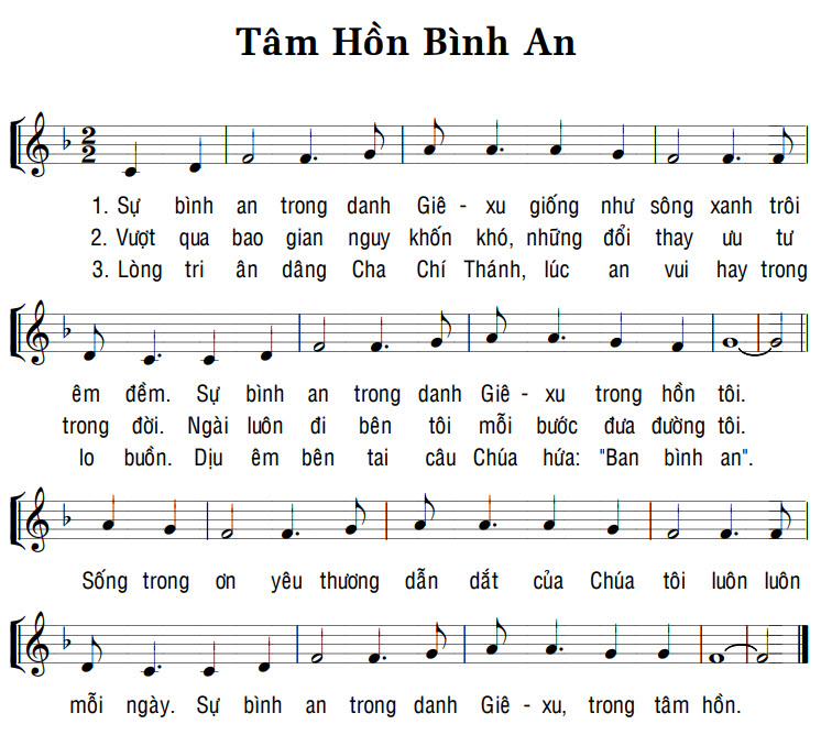 1. Sự bình an trong danh Giê-xu giống như sông xanh trôi êm đềm. Sự bình an trong danh Giê-xu trong hồn tôi. Sống trong ơn yêu thương dẫn dắt của Chúa tôi luôn luôn mỗi ngày. Sự bình an trong danh Giê-xu, trong tâm hồn. 2. Vượt qua bao gian nguy khốn khó, những đổi thay ưu tư trong đời. Ngài luôn đi bên tôi mỗi bước đưa đường tôi. Sống trong ơn yêu thương dẫn dắt của Chúa tôi luôn luôn mỗi ngày. Sự bình an trong danh Giê-xu, trong tâm hồn. 3. Lòng tri ân dâng Cha Chí Thánh, lúc an vui hay trong lo buồn. Dịu êm bên tai câu Chúa hứa: "Ban bình an". Sống trong ơn yêu thương dẫn dắt của Chúa tôi luôn luôn mỗi ngày. Sự bình an trong danh Giê-xu, trong tâm hồn.