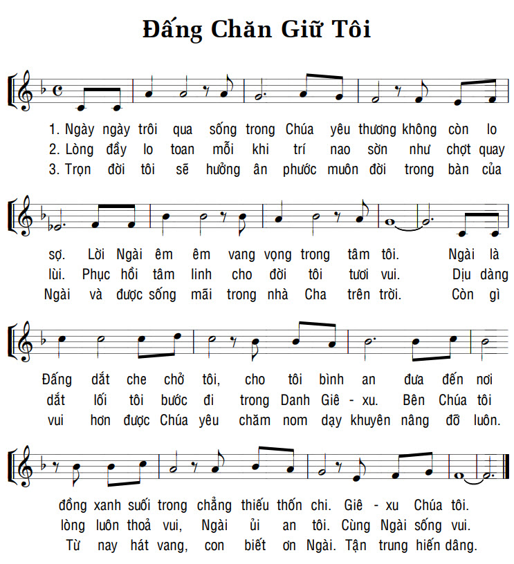 1. Ngày ngày trôi qua sống trong Chúa yêu thương không còn lo sợ. Lời Ngài êm êm vang vọng trong tâm tôi. Ngài là Đấng dắt che chở tôi, cho tôi bình an đưa đến nơi đồng xanh suối trong chẳng thiếu thốn chi. Giê-xu Chúa tôi. Từ nay hát vang, con biết ơn Ngài. Tận trung hiến dâng. 2. Lòng đầy lo toan mỗi khi trí nao sờn như chợt quay lùi. Phục hồi tâm linh cho đời tôi tươi vui. Dịu dàng dắt lối tôi bước đi trong Danh Giê-xu. Bên Chúa tôi lòng luôn thoả vui, Ngài ủi an tôi. Cùng Ngài sống vui. 3. Trọn đời tôi sẽ hưởng ân phước muôn đời trong bàn của Ngài và được sống mãi trong nhà Cha trên trời. Còn gì vui hơn được Chúa yêu chăm nom dạy khuyên nâng đỡ luôn.