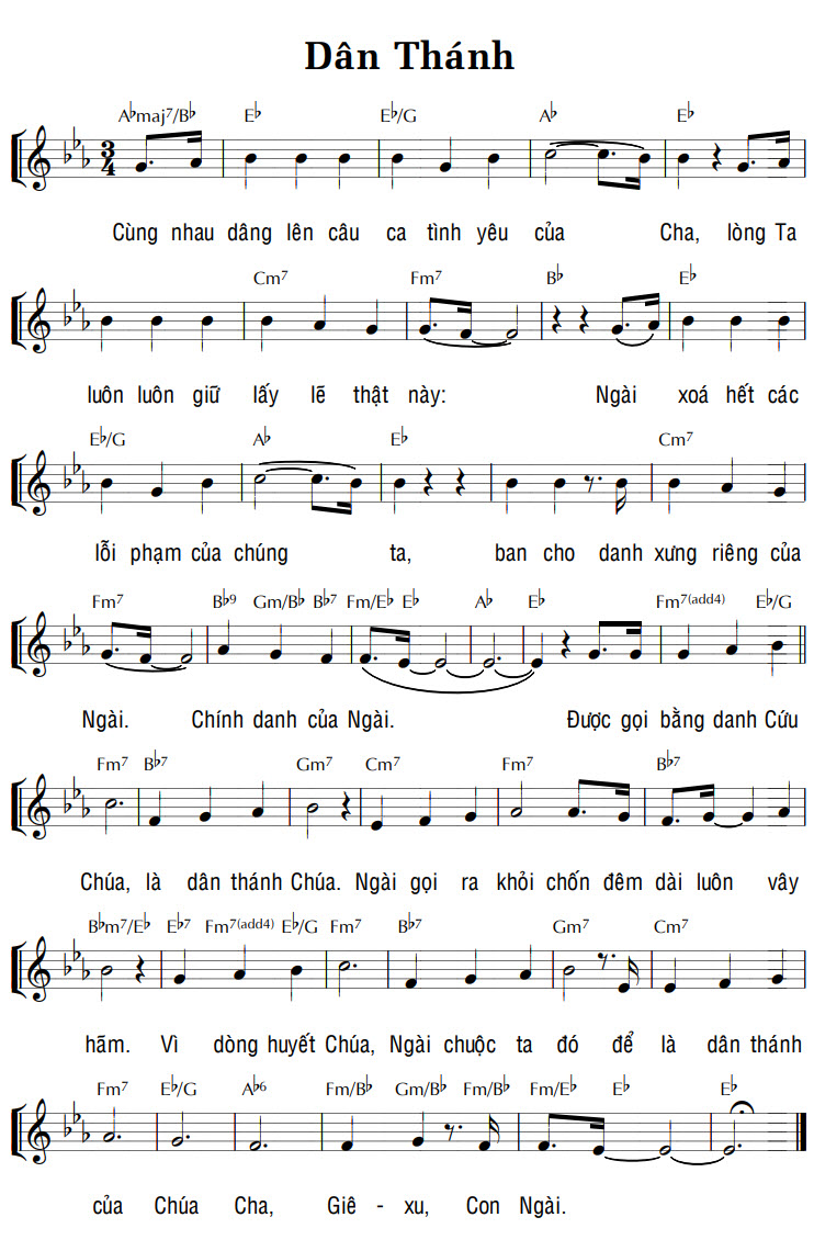 1. Cùng nhau dâng lên câu ca tình yêu của Cha, lòng Ta luôn luôn giữ lấy lẽ thật này: Ngài xoá hết các lỗi phạm của chúng ta, ban cho danh xưng riêng của Ngài. Chính danh của Ngài. Được gọi bằng danh Cứu Chúa, là dân thánh Chúa. Ngài gọi ra khỏi chốn đêm dài luôn vây hãm. Vì dòng huyết Chúa, Ngài chuộc ta đó để là dân thánh của Chúa Cha, Giê-xu, Con Ngài.