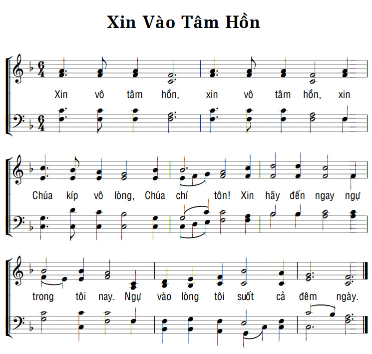 1. Xin vô tâm hồn, xin vô tâm hồn, xin Chúa kíp vô lòng, Chúa chí tôn! Xin hãy đến ngay ngự trong tôi nay. Ngự vào lòng tôi suốt cả đêm ngày.