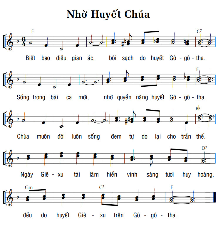 1. Biết bao điều gian ác, bôi sạch do huyết Gô - gô - tha. Sống trong bài ca mới, nhờ quyền năng huyết Gô - gô - tha. Chúa muôn đời luôn sống đem tự do lại cho trần thế. Ngày Giê - xu tái lâm hiển vinh sáng tươi huy hoàng, đều do huyết Giê - xu trên Gô - gô - tha.