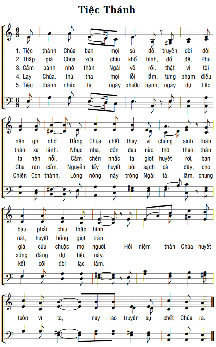 1. Tiệc thánh Chúa ban mọi Sứ đồ, truyền đời đời nên ghi nhớ. Rằng Chúa chết thay vì chúng sinh, thân báu phải chịu thập hình. tuôn vì ta, nay rao truyền sự chết Chúa ra. 2. Thập giá Chúa xưa chịu khổ hình, đồ đệ, Phụ thân xa lánh. Nhục nhã, đớn đau nào thở than, thân nát, huyết hồng giọt tràn. 3. Cầm bánh nhớ thân Ngài vỡ rồi, thật vì tội ta nên nỗi. Cầm chén nhắc ta giọt huyết roi, ban giá cứu chuộc mọi người. Hồi niệm thân Chúa huyết 4. Lạy Chúa, thứ tha mọi lỗi lầm, từng phạm điều Cha răn cấm. Nguyện lấy huyết bôi sạch cả đây, cho xứng đáng dự tiệc này. 5. Tiệc thánh nhắc ta ngày phước hạnh, ngày dự tiệc Chiên Con thánh. Lòng nóng nảy trông Ngài tái lâm, chung kết cõi đời lạc lầm.