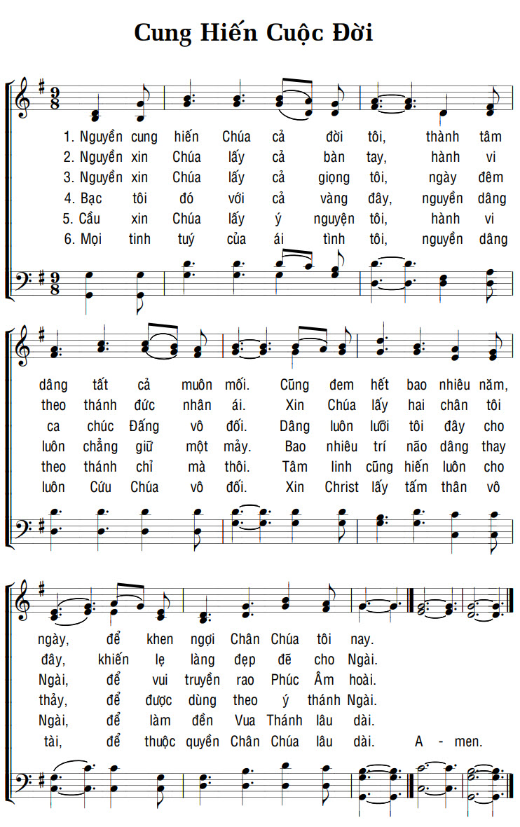 1. Nguyền cung hiến Chúa cả đời tôi, thành tâm dâng tất cả muôn mối. Cũng đem hết bao nhiêu năm, ngày, để khen ngợi Chân Chúa tôi nay. 2. Nguyền xin Chúa lấy cả bàn tay, hành vi theo thánh đức nhân ái. Xin Chúa lấy hai chân tôi đây, khiến le làng đẹp đẽ cho Ngài. 3. Nguyền xin Chúa lấy cả giọng tôi, ngày đêm ca chúc Đấng vô đối. Dâng luôn lưỡi tôi đây cho Ngài, để vui truyền rao Phúc Âm hoài. 4. Bạc tôi đó với cả vàng đây, nguyễn dâng luôn chẳng giữ một mảy. Bao nhiêu trí não dâng thay thảy, để được dùng theo ý thánh Ngài. 5. Cầu xin Chúa lấy ý nguyện tôi, hành vi theo thánh chỉ mà thôi. Tâm linh cũng hiến luôn cho Ngài, để làm đền Vua Thánh lâu dài. 6. Mọi tinh tuý của ái tình tôi, nguyền dâng luôn Cứu Chúa vô đối. Xin Christ lấy tấm thân vô tài, để thuộc quyền Chân Chúa lâu dài. A - men.