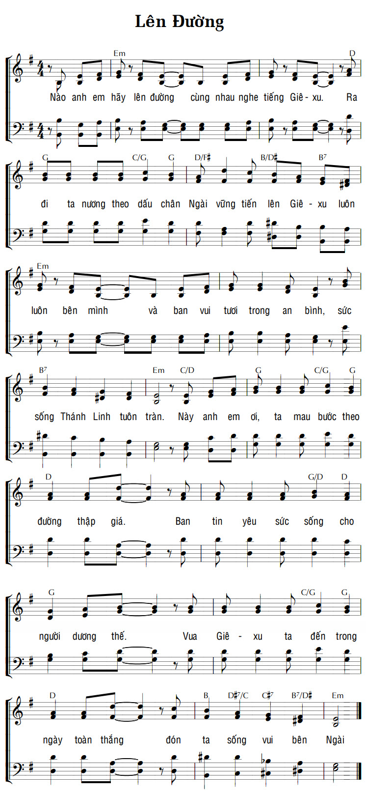 1. Nào anh em hãy lên đường cùng nhau nghe tiếng Giê-xu. Ra đi ta nương theo dấu chân Ngài vững tiến lên Giê-xu luôn luôn bên mình và ban vui tươi trong an bình, sức sống Thánh Linh tuôn tràn. Này anh em ơi, ta mau bước theo đường thập giá. Ban tin yêu sức sống cho người dương thế. Vua Giê-xu ta đến trong ngày toàn thắng đón ta sống vui bên Ngài.