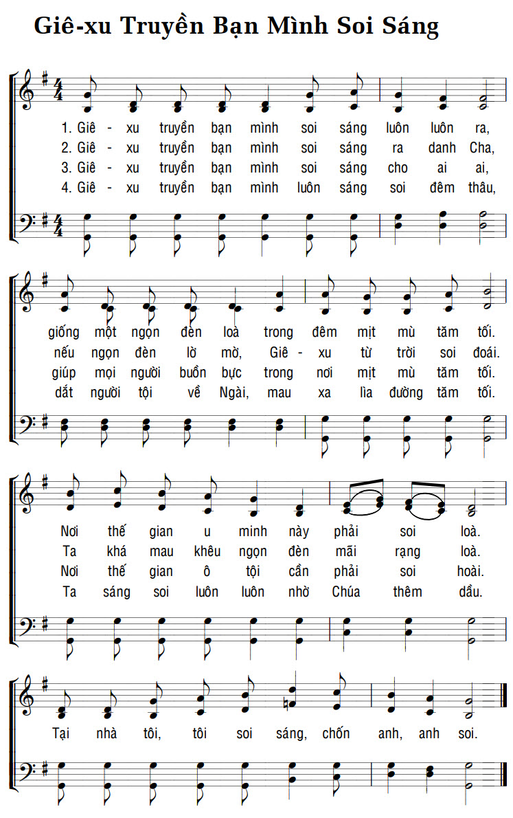 1. Giê-xu truyền bạn mình soi sáng luôn luôn ra, giống một ngọn đèn loà trong đêm mịt mù tăm tối. Nơi thế gian u minh này phải soi loà. Tại nhà tôi, tôi soi sáng, chốn anh, anh soi. 2. Giê-xu truyền bạn mình soi sáng ra danh Cha, nếu ngọn đèn lờ mờ, Giê-xu từ trời soi đoái. Ta khá mau khêu ngọn đèn mãi rạng loà. Tại nhà tôi, tôi soi sáng, chốn anh, anh soi. 3. Giê-xu truyền bạn mình soi sáng cho ai ai, giúp mọi người buồn bực trong nơi mịt mù tăm tối. Nơi thế gian ô tội cần phải soi hoài. Tại nhà tôi, tôi soi sáng, chốn anh, anh soi. 4. Giê-xu truyền bạn mình luôn sáng soi đêm thâu, dắt người tội về Ngài, mau xa lìa đường tăm tối. Ta sáng soi luôn luôn nhờ Chúa thêm dầu. Tại nhà tôi, tôi soi sáng, chốn anh, anh soi.