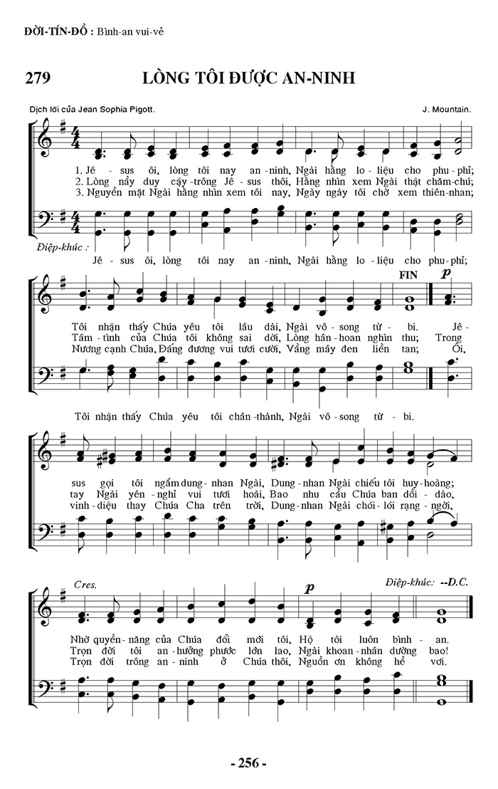 1. Jê-sus ôi, lòng tôi nay an-ninh, Ngài hằng lo-liệu cho phu-phỉ; Tôi nhận thấy Chúa yêu tôi lâu dài, Ngài vô-song từ-bi. Jê-sus gọi tôi ngắm dung-nhan Ngài, Dung-nhan Ngài chiếu tôi huy-hoàng; Nhờ quyền-năng của Chúa đổi mới tôi, Hộ tôi luôn bình an. 2. Lòng nầy duy cậy trông Jê-sus thôi, Hằng nhìn xem Ngài thật chăm-chú; Tâm-tình của Chúa tôi không sai dời, Lòng hân-hoan nghìn thu; Tay Ngài yên-nghỉ vui tươi hoài, Bao nhu cầu Chúa ban dồi dào. Trọn đời tôi an-hưởng phước lớn lao, Ngài khoan-nhân dường bao! 3. Nguyễn mặt Ngài hằng nhìn xem tôi nay, Ngày ngày tôi chờ xem thiên-nhan; Nương cạnh Chúa, Đấng đương vui tươi cười, Vầng mây đen liền tan; Chúa Cha trên trời, Dung-nhan Ngài chói-lói rạng ngời, Trọn đời trông an-ninh ở Chúa thôi, Nguồn ơn không hề vơi. Điệp khúc: Jê-sus ôi, lòng tôi nay an-ninh, Ngài hằng lo-liệu cho phu-phỉ; Tôi nhận thấy Chúa yêu tôi chân thành, Ngài vô-song từ-bi.