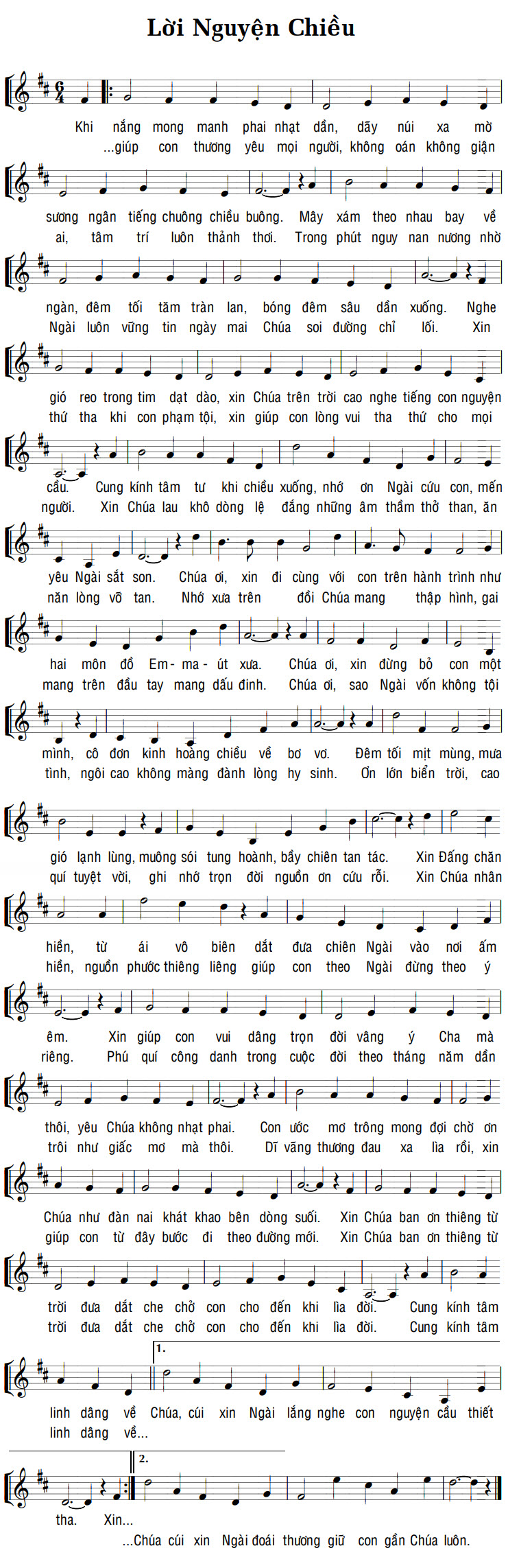 1. Khi nắng mong manh phai nhạt dần, dãy núi xa mờ sương ngân tiếng chuông chiều buông. Mây xám theo nhau bay về ngàn, đêm tối tăm tràn lan, bóng đêm sâu dần xuống. Nghe gió reo trong tim dạt dào, xin Chúa trên trời cao nghe tiếng con nguyện cầu. Cung kính tâm tư khi chiều xuống, nhớ ơn Ngài cứu con, mến yêu Ngài sắt son. Chúa ơi, xin đi cùng với con trên hành trình như hai môn đồ Em-ma-út xưa. Chúa ơi, xin đừng bỏ con một mình, cô đơn kinh hoàng chiều về bơ vơ. Đêm tối mịt mùng, mưa gió lạnh lùng, muông sói tung hoành, bầy chiên tan tác. Xin Đấng chăn hiền, từ ái vô biên dắt đưa chiên Ngài vào nơi ấm êm. Xin giúp con vui dâng trọn đời vâng ý Cha mà thôi, yêu Chúa không nhạt phai. Con ước mơ trông mong đợi chờ ơn Chúa như đàn nai khát khao bên dòng suối. Xin Chúa ban ơn thiêng từ trời đưa dắt che chở con cho đến khi lìa đời. Cung kính tâm linh dâng về Chúa, cúi xin Ngài lắng nghe con nguyện cầu thiết 2. ...giúp con thương yêu mọi người, không oán không giận ai, tâm trí luôn thảnh thơi. Trong phút nguy nan nương nhờ Ngài luôn vững tin ngày mai Chúa soi đường chỉ lối. Xin thứ tha khi con phạm tội, xin giúp con lòng vui tha thứ cho mọi người. Xin Chúa lau khô dòng lệ đắng những âm thầm thở than, ăn năn lòng vỡ tan. Nhớ xưa trên đồi Chúa mang thập hình, gai mang trên đầu tay mang dấu đinh. Chúa ơi, sao Ngài vốn không tội tình, ngôi cao không màng đành lòng hy sinh. Ơn lớn biển trời, cao quí tuyệt vời, ghi nhớ trọn đời nguồn ơn cứu rỗi. Xin Chúa nhân hiền, nguồn phước thiêng liêng giúp con theo Ngài đừng theo ý riêng. Phú quí công danh trong cuộc đời theo tháng năm dần trôi như giấc mơ mà thôi. Dĩ vãng thương đau xa lìa rồi, xin giúp con từ đây bước đi theo đường mới. Xin Chúa ban ơn thiêng từ trời đưa dắt che chở con cho đến khi lìa đời. Cung kính tâm linh dâng về... tha. Xin... Chúa cúi xin Ngài đoái thương giữ con gần Chúa luôn.