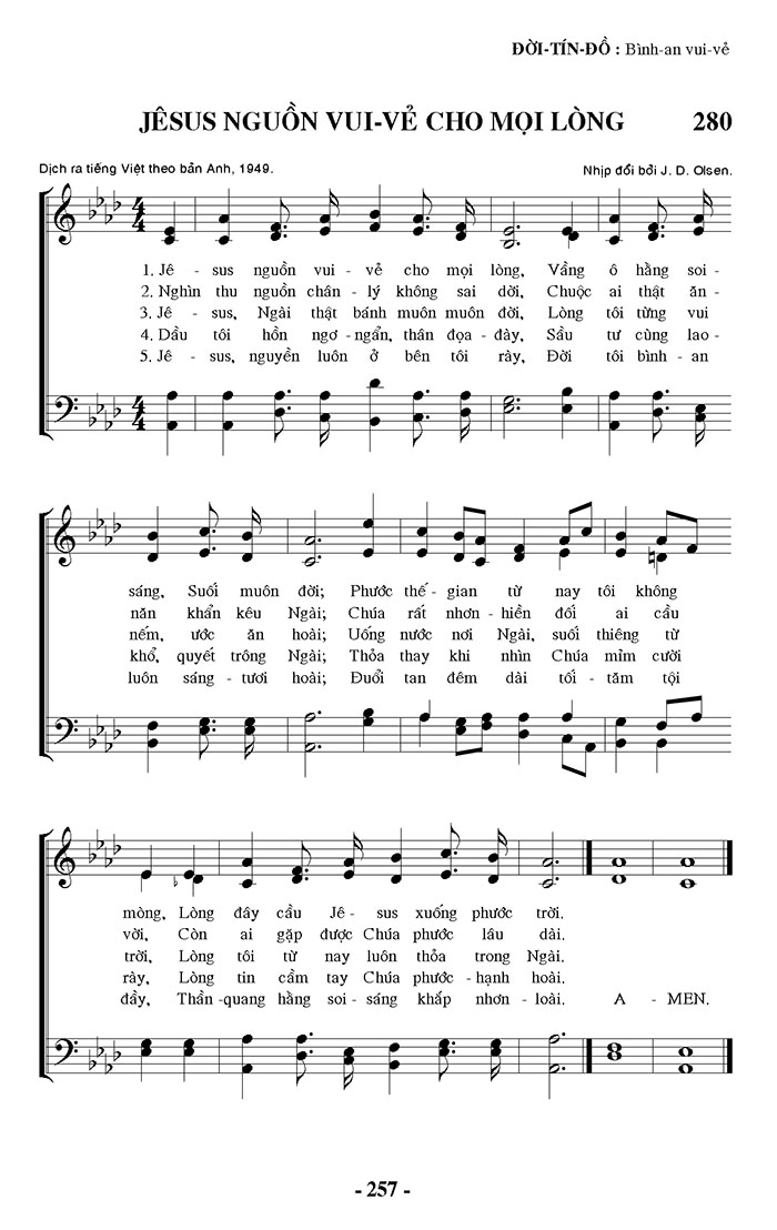 1. Jê-sus nguồn vui vẻ cho mọi lòng, Vầng ô hằng soi sáng, Suối muôn đời; Phước thế gian từ nay tôi không mong, Lòng đây cầu Jê-sus xuống phước trời. 2. Nghìn thu nguồn chân lý không sai dời, Chuộc ai thật ăn năn khẩn kêu Ngài; Chúa rất nhơn-hiền đối ai cầu nếm, ước ăn hoài; Còn ai gặp được Chúa phước lâu dài. 3. Jê-sus, Ngài thật bánh muôn muôn đời, Lòng tôi từng vui khổ, quyết trông Ngài; Uống nước nơi Ngài, suối thiêng từ trời, Lòng tôi từ nay luôn thỏa trong Ngài. 4. Dầu tôi hồn ngơ-ngẩn, thân đọa đày, Sầu tư cùng lao luôn sáng tươi hoài; Thỏa thay khi nhìn Chúa mỉm cười rày, Lòng tin cầm tay Chúa phước-hạnh hoài. 5. Jê-sus, nguyền luôn ở bên tôi rày, Đời tôi bình an Đuổi tan đêm dài tối tăm tội đầy, Thần-quang hằng soi-sáng khắp nhơn-loài. Outro: A - MEN.