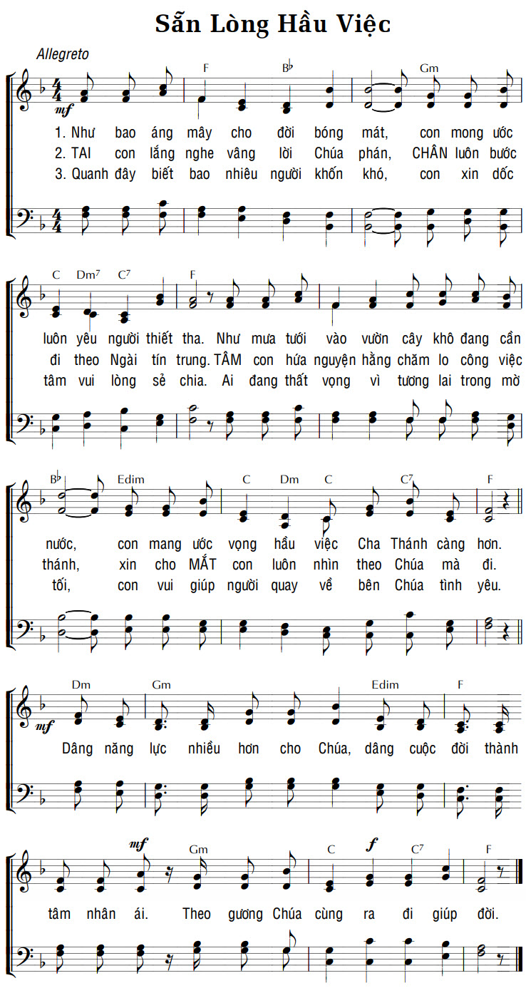 1. Như bao áng mây cho đời bóng mát, con mong ước luôn yêu người thiết tha. Như mưa tưới vào vườn cây khô đang cần nước, con mang ước vọng hầu việc Cha Thánh càng hơn. 2. TAI con lắng nghe vâng lời Chúa phán, CHÂN luôn bước đi theo Ngài tín trung. TÂM con hứa nguyện hằng chăm lo công việc thánh, xin cho MẮT con luôn nhìn theo Chúa mà đi. 3. Quanh đây biết bao nhiêu người khốn khó, con xin dốc tâm vui lòng sẻ chia. Ai đang thất vọng vì tương lai trong mờ tối, con vui giúp người quay về bên Chúa tình yêu. Điệp khúc: Dâng năng lực nhiều hơn cho Chúa, dâng cuộc đời thành tâm nhân ái. Theo gương Chúa cùng ra đi giúp đời.