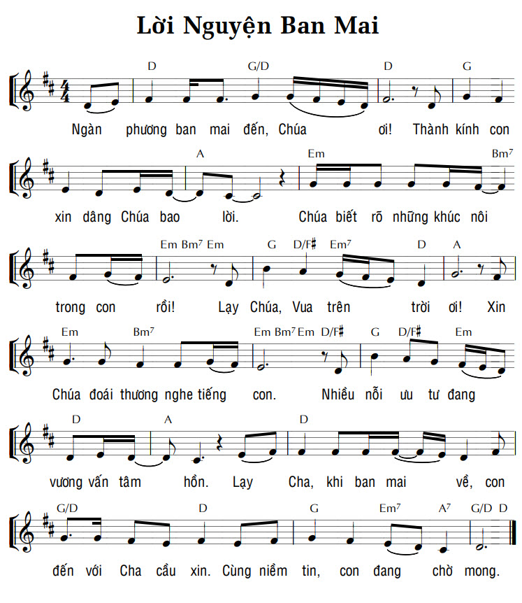 1. Ngàn phương ban mai đến, Chúa ơi! Thành kính con xin dâng Chúa bao lời. Chúa biết rõ những khúc nôi trong con rồi! Lạy Chúa, Vua trên trời ơi! Xin Chúa đoái thương nghe tiếng con. Nhiều nỗi ưu tư đang vương vấn tâm hồn. Lạy Cha, khi ban mai về, con đến với Cha cầu xin. Cùng niềm tin, con đang chờ mong.
