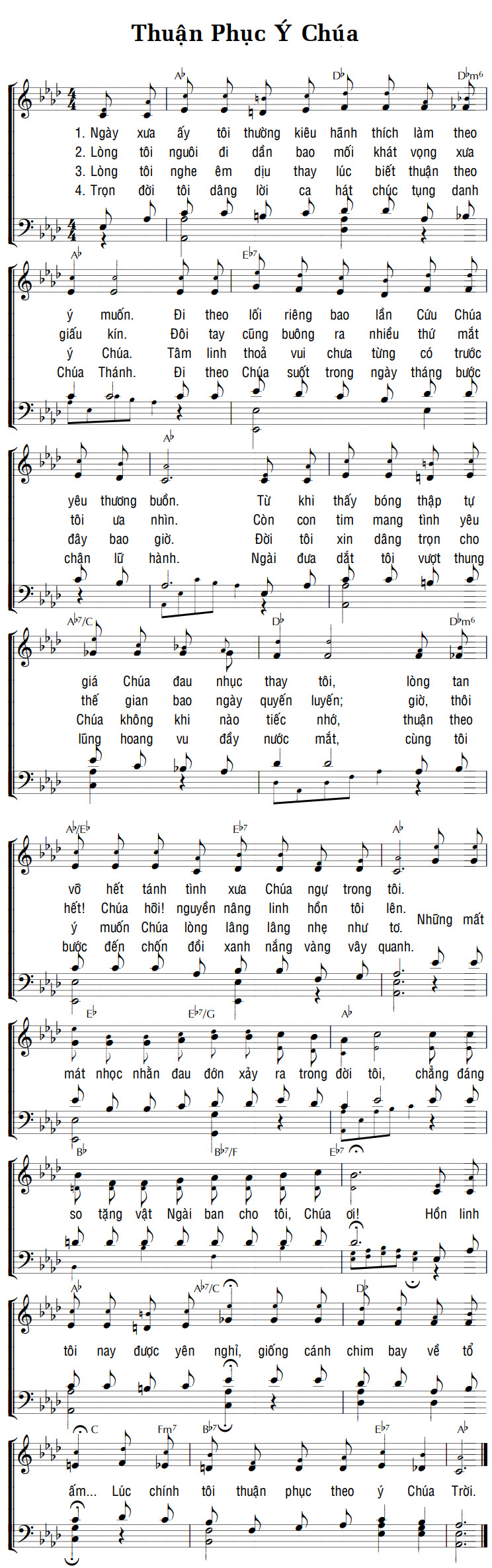 1. Ngày xưa ấy tôi thường kiêu hãnh thích làm theo ý muốn. Đi theo lối riêng bao lần Cứu Chúa yêu thương buồn. Từ khi thấy bóng thập tự giá Chúa đau nhục thay tôi, lòng tan vỡ hết tánh tình xưa Chúa ngự trong tôi. Những mất mát nhọc nhằn đau đớn xảy ra trong đời tôi, chẳng đáng so tặng vật Ngài ban cho tôi, Chúa ơi! Hồn linh tôi nay được yên nghỉ, giống cánh chim bay về tổ ấm... Lúc chính tôi thuận phục theo ý Chúa Trời. 2. Lòng tôi nguôi đi dần bao mối khát vọng xưa giấu kín. Đôi tay cũng buông ra nhiều thứ mắt tôi ưa nhìn. Còn con tim mang tình yêu thế gian bao ngày quyến luyến; giờ, thôi hết! Chúa hỡi! nguyền nâng linh hồn tôi lên. Những mất mát nhọc nhằn đau đớn xảy ra trong đời tôi, chẳng đáng so tặng vật Ngài ban cho tôi, Chúa ơi! Hồn linh tôi nay được yên nghỉ, giống cánh chim bay về tổ ấm... Lúc chính tôi thuận phục theo ý Chúa Trời. 3. Lòng tôi nghe êm dịu thay lúc biết thuận theo ý Chúa. Tâm linh thoả vui chưa từng có trước đây bao giờ. Đời tôi xin dâng trọn cho Chúa không khi nào tiếc nhớ, thuận theo ý muốn Chúa lòng lâng lâng nhẹ như tơ. Những mất mát nhọc nhằn đau đớn xảy ra trong đời tôi, chẳng đáng so tặng vật Ngài ban cho tôi, Chúa ơi! Hồn linh tôi nay được yên nghỉ, giống cánh chim bay về tổ ấm... Lúc chính tôi thuận phục theo ý Chúa Trời. 4. Trọn đời tôi dâng lời ca hát chúc tụng danh Chúa Thánh. Đi theo Chúa suốt trong ngày tháng bước chân lữ hành. Ngài đưa dắt tôi vượt thung lũng hoang vu đầy nước mắt, cùng tôi bước đến chốn đồi xanh nắng vàng vây quanh. Những mất mát nhọc nhằn đau đớn xảy ra trong đời tôi, chẳng đáng so tặng vật Ngài ban cho tôi, Chúa ơi! Hồn linh tôi nay được yên nghỉ, giống cánh chim bay về tổ ấm... Lúc chính tôi thuận phục theo ý Chúa Trời.