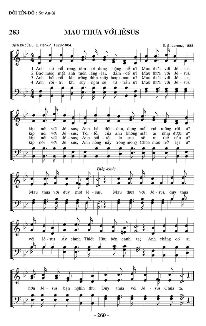 1. Anh có rối - reng, tâm - trí đang nặng nề ư? Mau thưa với Jê - sus, kíp nói với Jê-sus; Anh há đớn đau, đang mất vui mừng rồi ư? 2. Bao nước mắt anh tuôn láng lai, dầm dề ư? Mau thưa với Jê - sus, kíp nói với Jê-sus; Tội lỗi của anh không mắt ai nhìn được ư? 3. Anh bối - rối khi trông đám mây hoạn nạn ư? Mau thưa với Jê - sus, kíp nói với Jê-sus; Anh bối rối lo sau sẽ ra thể nào ư? 4. Anh rối - trí khi suy nghĩ sẽ từ trần ư? Mau thưa với Jê-sus, kíp nói với Jê-sus; Anh nóng nảy trông-mong Chúa mau trở lại ư? Điệp khúc: Mau thưa với duy một Jê-sus. Mau thưa với Jê-sus, duy thưa với Jê-sus Ấy chính Thiết Hữu bên cạnh ta; Anh chẳng có ai hơn Jê-sus bạn nghìn thu, Duy thưa với Jê-sus Chúa ta.
