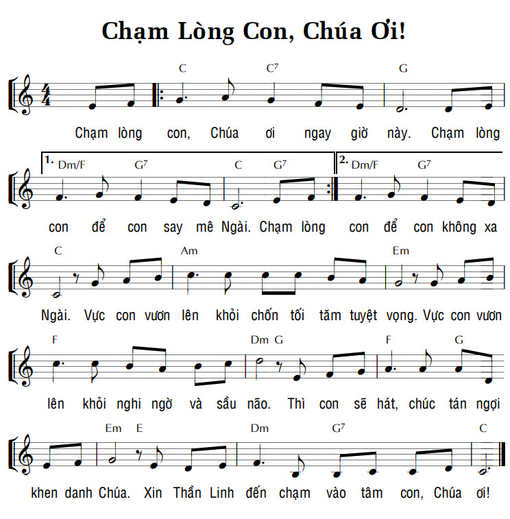 1. Chạm lòng con, Chúa ơi ngay giờ này. Chạm lòng con để con say mê Ngài. Vực con vươn lên khỏi chốn tối tăm tuyệt vọng. Vực con vươn lên khỏi nghi ngờ và sầu não. Thì con sẽ hát, chúc tán ngợi khen danh Chúa. Xin Thần Linh đến chạm vào tâm con, Chúa ơi! 2. Chạm lòng con, Chúa ơi ngay giờ này. Chạm lòng con để con không xa Ngài. Vực con vươn lên khỏi chốn tối tăm tuyệt vọng. Vực con vươn lên khỏi nghi ngờ và sầu não. Thì con sẽ hát, chúc tán ngợi khen danh Chúa. Xin Thần Linh đến chạm vào tâm con, Chúa ơi!
