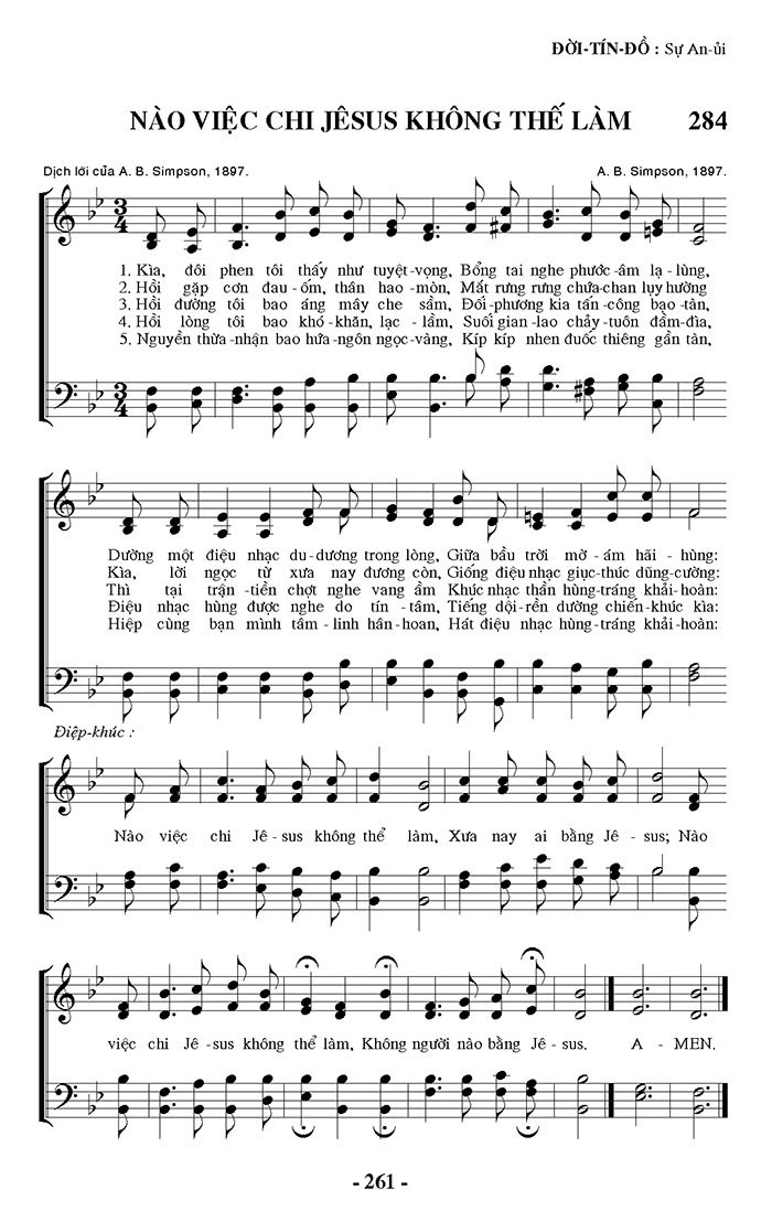 1. Kìa, đôi phen tôi thấy như tuyệt vọng, Bổng tai nghe phước âm lạ - lùng, Dường một điệu nhạc du - dương trong lòng, Giữa bầu trời mờ - ám hãi - hùng: 2. Hồi gặp cơn đau - ốm, thân hao mòn, Mắt rưng rưng chứa chan lụy hường Kìa, lời ngọc từ xưa nay đương còn, Giống điệu nhạc giục thúc dũng cường: 3. Hồi đường tôi bao áng mây che sầm, Đối phương kia tấn công bạo tàn, Thì tại trận tiền chợt nghe vang âm Khúc nhạc thần hùng tráng khải hoàn: 4. Hồi lòng tôi bao khó khăn, lạc - lầm, Suối gian lao chảy tuôn đầm đìa, Điệu nhạc hùng được nghe do tín tâm, Tiếng dội rền dường chiến khúc kìa: 5. Nguyền thừa nhận bao hứa ngôn ngọc vàng, Kíp kíp nhen đuốc thiêng gần tàn, Hiệp cùng bạn mình tâm - linh hân hoan, Hát điệu nhạc hùng tráng khải hoàn: Điệp khúc: Nào việc chi Jê-sus không thể làm, Xưa nay ai bằng Jê-sus; Nào việc chi Jê-sus không thể làm, Không người nào bằng Jê-sus. A - MEN.