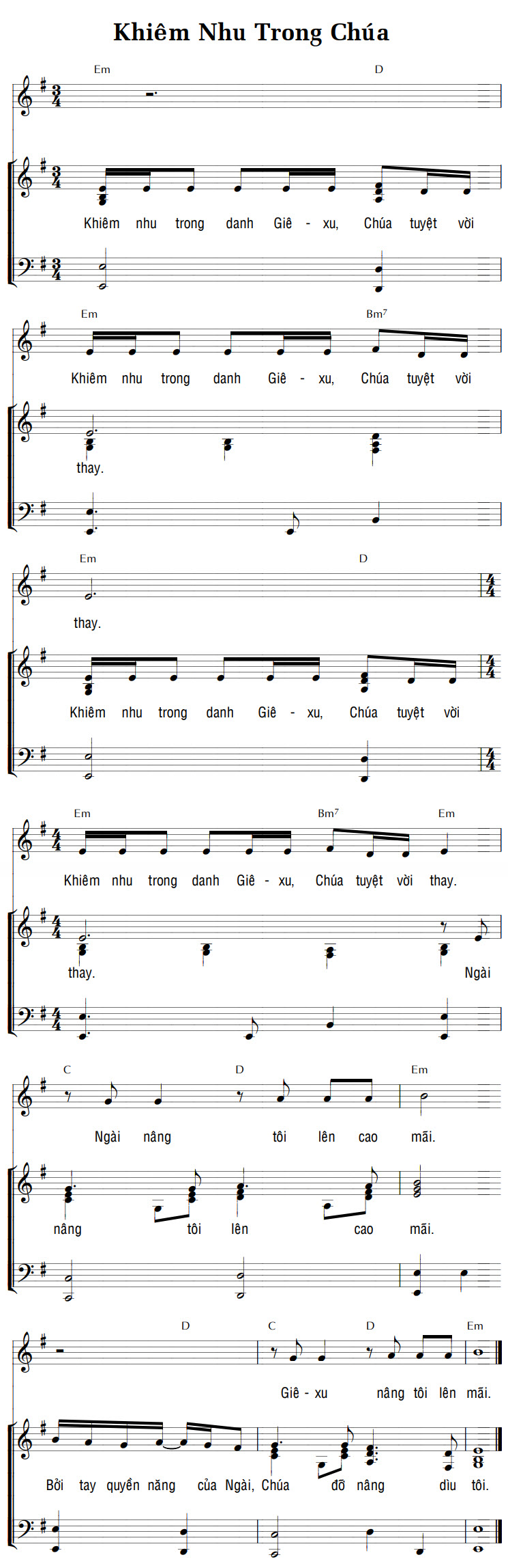 1. Khiêm nhu trong danh Giê-xu, Chúa tuyệt vời thay. Ngài nâng tôi lên cao mãi. Bởi tay quyền năng của Ngài, Chúa đỡ nâng dìu tôi.