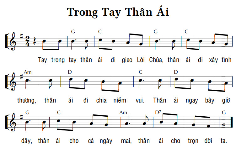1. Tay trong tay thân ái đi gieo Lời Chúa, thân ái đi xây tình thương, thân ái đi chia niềm vui. Thân ái ngay bây giờ đây, thân ái cho cả ngày mai, thân ái cho trọn đời ta.