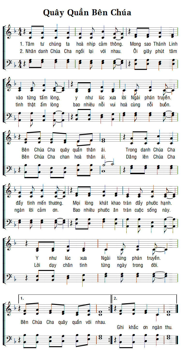 1. Tâm tư chúng ta hoà nhịp cảm thông. Mong sao Thánh Linh vào từng tấm lòng, y như lúc xưa lời Ngài phán truyền. Bên Chúa Cha quây quần thân ái. Trong danh Chúa Cha đầy tình mến thương. Mọi lòng khát khao tràn đầy phước hạnh. Y như lúc xưa Ngài từng phán truyền. Bên Chúa Cha quây quần với nhau. 2. Nhân danh Chúa Cha ngồi lại với nhau. Ôi giây phút tâm tình thật ấm lòng bao nhiêu nỗi vui hoà cùng nỗi buồn. Bên Chúa Cha chan hoà thân ái. Dâng lên Chúa Cha ngàn lời cảm ơn. Bao nhiêu phước ân tràn cuộc sống này. Lời dạy chân tình từng ngày trong đời. Ghi khắc ơn ngàn thu.
