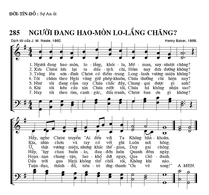 1. Ngươi đang hao mòn, lo lắng, khóc la, Mê man, suy nhược chăng? Nầy, nghe Christ truyền: "Ai đến với Ta Không băn khoăn." 2. Xưa Christ lưu lại ta dấu - tích chi, Hôm nay đưa đường không? Kìa, nhìn chơn và tay có vết ghi Luôn nơi hông. 3. Trông lên sơn - đình Christ có điểm - trang Long - lanh vương - miện không? Ừ, thật vương - miện, nhưng khác thế gian, Duy gai chông. 4. Tôi chăm theo Ngài vâng giữ phép - khuôn, Chúa thưởng chỉ hiện nay? Nầy, "lụy chan buồn - lo, đau - đớn luôn Quanh đêm ngày." 5. Như tôi đang cầm tay Chúa chắc đây, Chung - qui được gì anh? Hoạn - nạn chung - tận, lao - khổ dứt ngay, Qua Gió - danh. 6. Khi tôi kêu cầu xin Chúa rước tôi, Chúa há không nhận sao? Dầu trời qua Ngài không thể chối tôi, Không khi nào. 7. Nay tôi theo tìm, canh - gác, đấu tranh, Christ ban ơn gì không? Tuận - đạo, thánh - đồ, tiên - tri ứng - thanh: "Ơn vô song!" A-MEN.