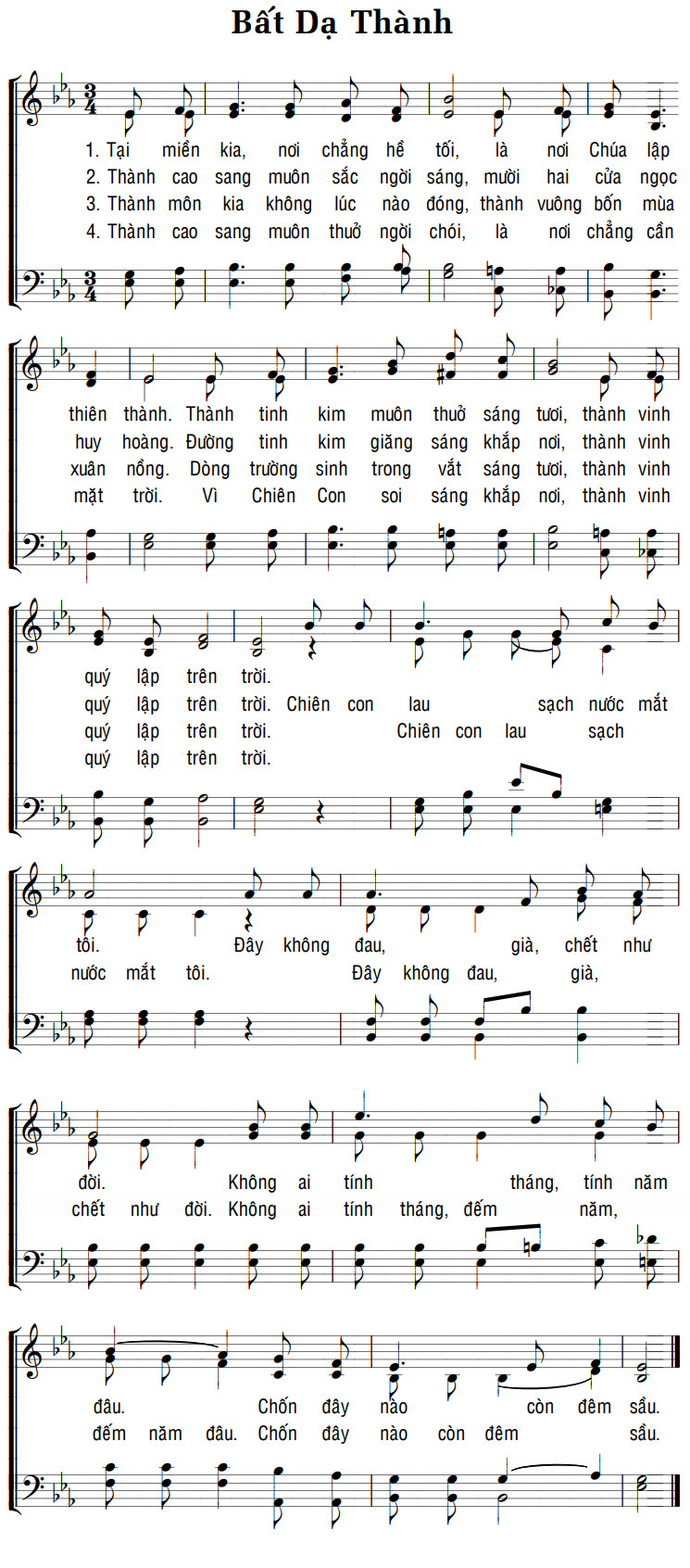 1. Tại miền kia, nơi chẳng hề tối, là nơi Chúa lập thiên thành. Thành tinh kim muôn thuở sáng tươi, thành vinh quý lập trên trời. Đây không đau, già, chết như đời. Không ai tính tháng, tính năm đâu. Chốn đây nào còn đêm sầu. 2. Thành cao sang muôn sắc ngời sáng, mười hai cửa ngọc huy hoàng. Đường tinh kim giăng sáng khắp nơi, thành vinh quý lập trên trời. Chiên con lau sạch nước mắt tôi. Không ai tính tháng, đếm năm, đâu. Chốn đây nào còn đêm sầu. 3. Thành môn kia không lúc nào đóng, thành vuông bốn mùa xuân nồng. Dòng trường sinh trong vắt sáng tươi, thành vinh quý lập trên trời. Đây không đau, già, chết như đời. Không ai tính tháng, tính năm đâu. Chốn đây nào còn đêm sầu. 4. Thành cao sang muôn thuở ngời chói, là nơi chẳng cần mặt trời. Vì Chiên Con soi sáng khắp nơi, thành vinh quý lập trên trời. Chiên con lau sạch nước mắt tôi. Không ai tính tháng, đếm năm, đâu. Chốn đây nào còn đêm sầu.