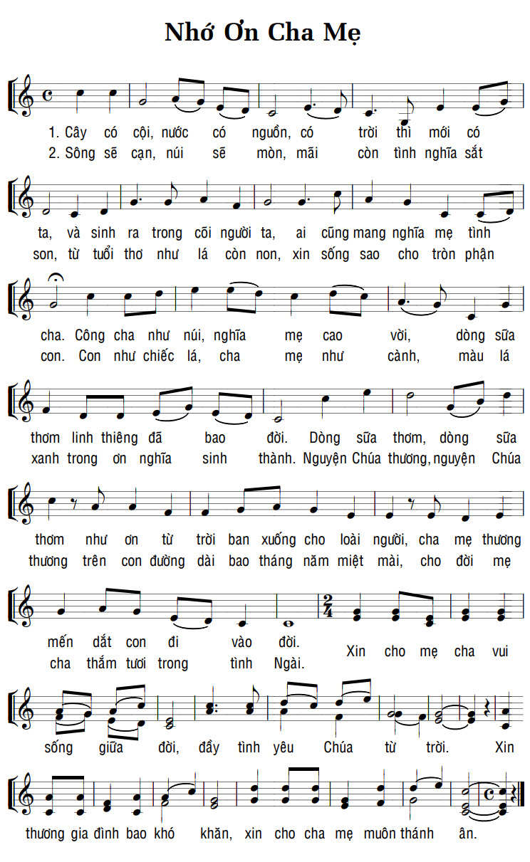1. Cây có cội, nước có nguồn, có trời thì mới có ta, và sinh ra trong cõi người ta, ai cũng mang nghĩa mẹ tình cha. Công cha như núi, nghĩa mẹ cao vời, dòng sữa thơm linh thiêng đã bao đời. Dòng sữa thơm, dòng sữa thơm như ơn từ trời ban xuống cho loài người, cha mẹ thương mến dắt con đi vào đời. Xin cho mẹ cha vui sống giữa đời, đầy tình yêu Chúa từ trời. Xin thương gia đình bao khó khăn, xin cho cha mẹ muôn thánh ân. 2. Sông sẽ cạn, núi sẽ mòn, mãi còn tình nghĩa sắt son, từ tuổi thơ như lá còn non, xin sống sao cho tròn phận con. Con như chiếc lá, cha mẹ như cành, màu lá xanh trong ơn nghĩa sinh thành. Nguyện Chúa thương, nguyện Chúa thương trên con đường dài bao tháng năm miệt mài, cho đời mẹ cha thắm tươi trong tình Ngài. Xin cho mẹ cha vui sống giữa đời, đầy tình yêu Chúa từ trời. Xin thương gia đình bao khó khăn, xin cho cha mẹ muôn thánh ân.
