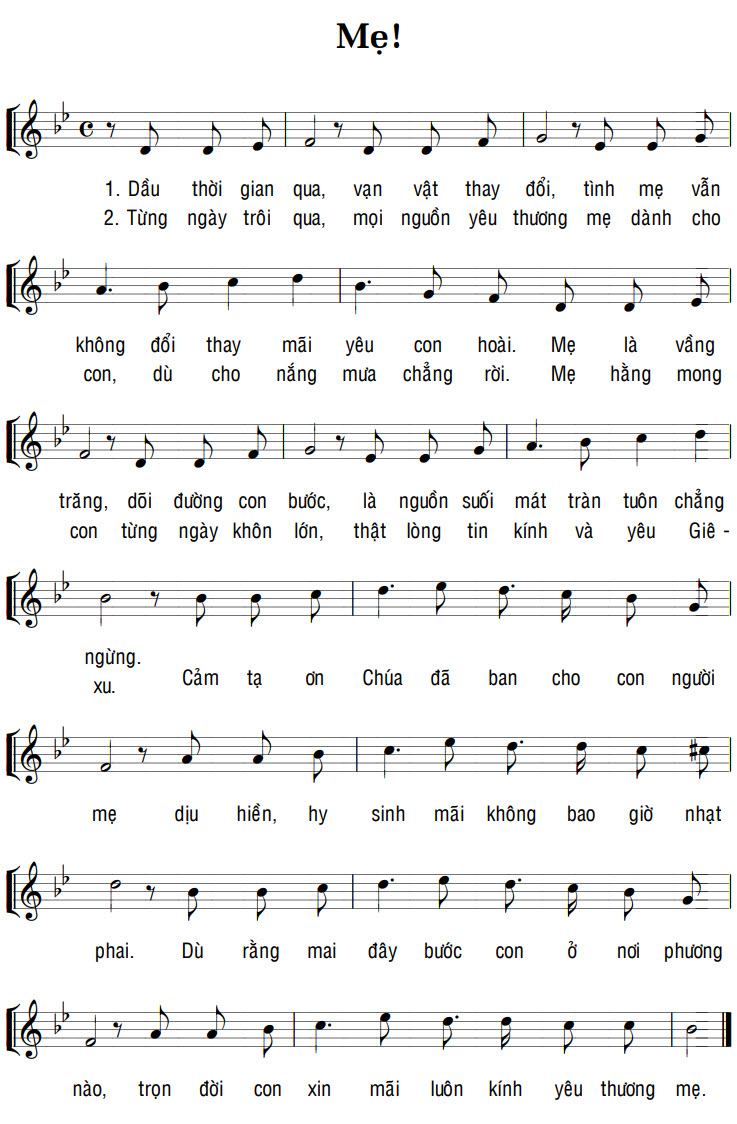 1. Dầu thời gian qua, vạn vật thay đổi, tình mẹ vẫn không đổi thay mãi yêu con hoài. Mẹ là vầng trăng, dõi đường con bước, là nguồn suối mát tràn tuôn chẳng ngừng. Cảm tạ ơn Chúa đã ban cho con người mẹ dịu hiền, hy sinh mãi không bao giờ nhạt phai. Dù rằng mai đây bước con ở nơi phương nào, trọn đời con xin mãi luôn kính yêu thương mẹ. 2. Từng ngày trôi qua, mọi nguồn yêu thương mẹ dành cho con, dù cho nắng mưa chẳng rời. Mẹ hằng mong con từng ngày khôn lớn, thật lòng tin kính và yêu Giê-xu. Cảm tạ ơn Chúa đã ban cho con người mẹ dịu hiền, hy sinh mãi không bao giờ nhạt phai. Dù rằng mai đây bước con ở nơi phương nào, trọn đời con xin mãi luôn kính yêu thương mẹ.