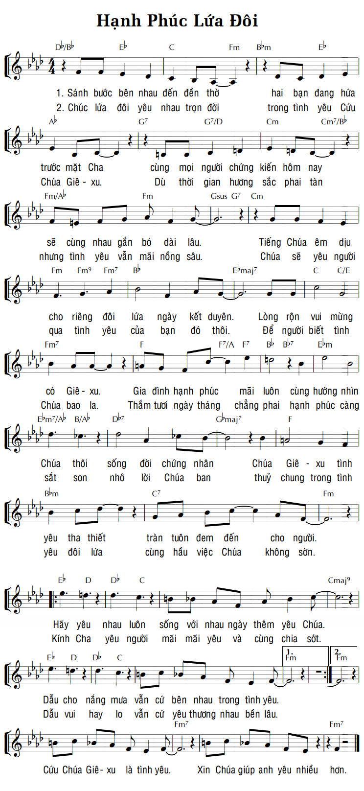 1. Sánh bước bên nhau đến đền thờ hai bạn đang hứa trước mặt Cha cùng mọi người chứng kiến hôm nay sẽ cùng nhau gắn bó dài lâu. Tiếng Chúa êm dịu cho riêng đôi lứa ngày kết duyên. Lòng rộn vui mừng có Giê-xu. Gia đình hạnh phúc mãi luôn cùng hướng nhìn Chúa thôi sống đời chứng nhân Chúa Giê-xu tình yêu tha thiết tràn tuôn đem đến cho người. 2. Chúc lứa đôi yêu nhau trọn đời trong tình yêu Cứu Chúa Giê-xu. Dù thời gian hương sắc phai tàn nhưng tình yêu vẫn mãi nồng sâu. Chúa sẽ yêu người qua tình yêu của bạn đó thôi. Để người biết tình Chúa bao la. Thắm tươi ngày tháng chẳng phai hạnh phúc càng sắt son nhớ lời Chúa ban thuỷ chung trong tình yêu đôi lứa cùng hầu việc Chúa không sờn. Điệp khúc: Hãy yêu nhau luôn sống với nhau ngày thêm yêu Chúa. Kính Cha yêu người mãi mãi yêu và cùng chia sốt. Dẫu cho nắng mưa vẫn cứ bên nhau trong tình yêu. Dẫu vui hay lo vẫn cứ yêu thương nhau bền lâu. Cứu Chúa Giê-xu là tình yêu. Xin Chúa giúp anh yêu nhiều hơn.