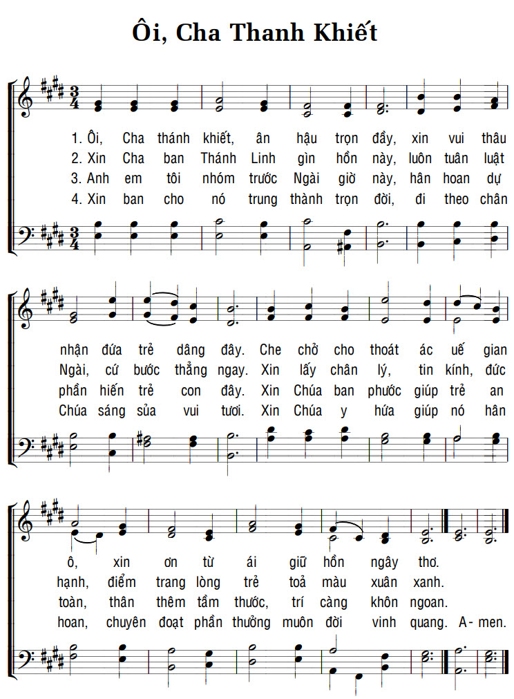 1. Ôi, Cha thánh khiết, ân hậu trọn đầy, xin vui thâu nhận đứa trẻ dâng đây. Che chở cho thoát ác uế gian ô, xin ơn từ ái giữ hồn ngây thơ. 2. Xin Cha ban Thánh Linh gìn hồn này, luôn tuân luật Ngài, cứ bước thẳng ngay. Xin lấy chân lý, tin kính, đức hạnh, điểm trang lòng trẻ toả màu xuân xanh. 3. Anh em tôi nhóm trước Ngài giờ này, hân hoan dự phần hiến trẻ con đây. Xin Chúa ban phước giúp trẻ an toàn, thân thêm tầm thước, trí càng khôn ngoan. 4. Xin ban cho nó trung thành trọn đời, đi theo chân Chúa sáng sủa vui tươi. Xin Chúa y hứa giúp nó hân hoan, chuyên đoạt phần thưởng muôn đời vinh quang. A-men.