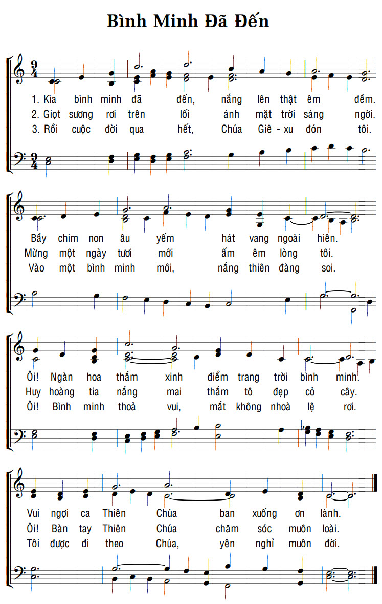 1. Kìa bình minh đã đến, nắng lên thật êm đềm. Bầy chim non âu yếm hát vang ngoài hiên. Ôi! Ngàn hoa thắm xinh điểm trang trời bình minh. Vui ngợi ca Thiên Chúa ban xuống ơn lành. 2. Giọt sương rơi trên lối ánh mặt trời sáng ngời. Mừng một ngày tươi mới ấm êm lòng tôi. Huy hoàng tia nắng mai thắm tô đẹp cỏ cây. Ôi! Bàn tay Thiên Chúa chăm sóc muôn loài. 3. Rồi cuộc đời qua hết, Chúa Giê-xu đón tôi. Vào một bình minh mới, nắng thiên đàng soi. Ôi! Bình minh thoả vui, mắt không nhoà lệ rơi. Tôi được đi theo Chúa, yên nghỉ muôn đời.