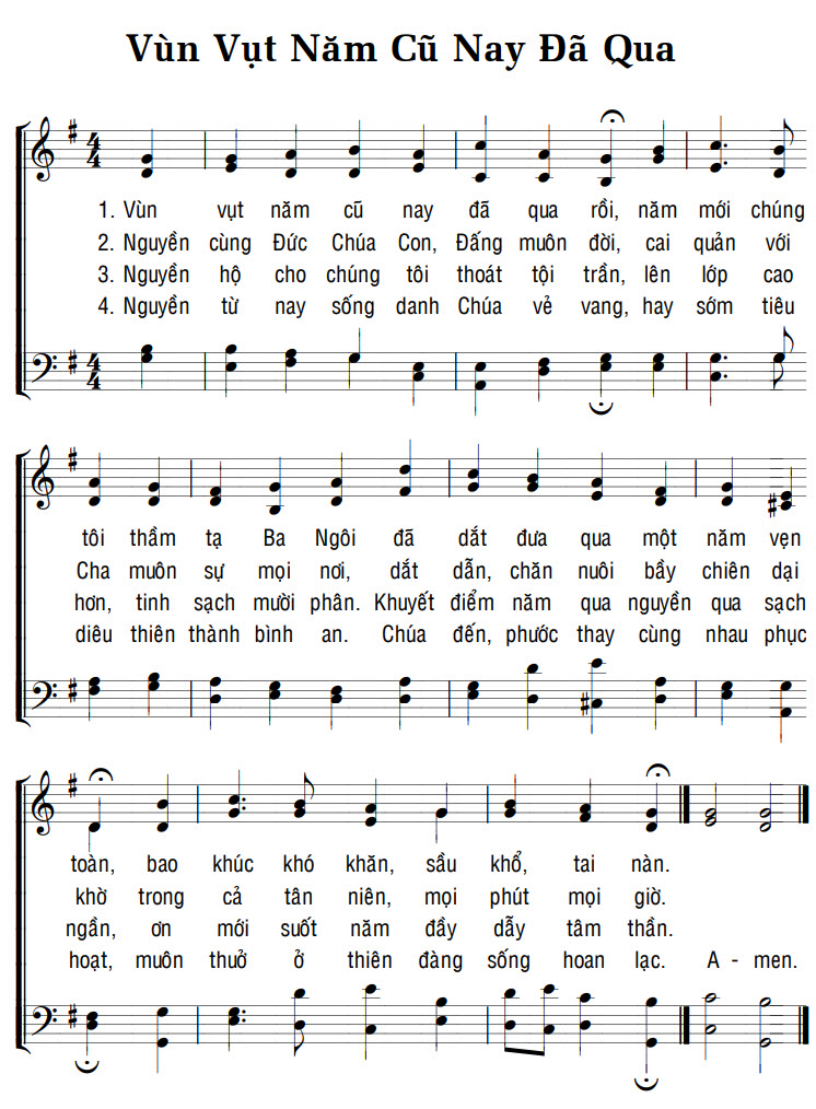 1. Vùn vụt năm cũ nay đã qua rồi, năm mới chúng tôi thầm tạ Ba Ngôi đã dắt đưa qua một năm vẹn toàn, bao khúc khó khăn, sầu khổ, tai nàn. 2. Nguyện cùng Đức Chúa Con, Đấng muôn đời, cai quản với Cha muôn sự mọi nơi, dắt dẫn, chăn nuôi bầy chiên dại khờ trong cả tân niên, mọi phút mọi giờ. 3. Nguyện hộ cho chúng tôi thoát tội trần, lên lớp cao hơn, tinh sạch mười phân. Khuyết điểm năm qua nguyền qua sạch ngần, ơn mới suốt năm đầy dẫy tâm thần. 4. Nguyện từ nay sống danh Chúa vẻ vang, hay sớm tiêu diêu thiên thành bình an. Chúa đến, phước thay cùng nhau phục hoạt, muôn thuở ở thiên đàng sống hoan lạc. A - men.