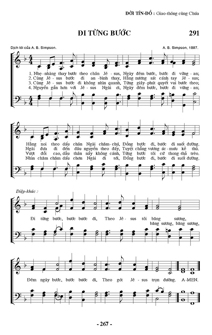 1. Nhẹ nhàng thay bước theo chân Jê-sus, Ngày đêm bước, bước đi vững-an; Hằng noi theo dấu chân Ngài chăm-chú, Đồng bước đi, bước đi suốt đường. 2. Cùng Jê-sus bước đi an bình thay, Hằng nương sát cánh tay Jêsus; Ngài đưa đi đến đâu nguyền theo đấy, Tuyệt chẳng vương ác-mưu kẻ thù. 3. Cùng Jê-sus bước đi không nhìn quanh, Từng giây phút quyết vui bước theo; Vượt đồi cao, dẫu thân nầy không cánh, Từng bước tôi cứ thong thả trèo. 4. Nguyện gần hơn với Jê-sus Ngài ơi, Ngày đêm bước, bước đi vững-an; Nhìn chăm chăm dấu chơn Ngài đi tới, Đồng bước đi, bước đi suốt đường. Điệp khúc: Đi từng bước, bước bước đi, Theo Jê-sus tôi bằng sương, bằng sương, bằng sương, Đêm ngày bước, bước bước đi, Theo gót Jê-sus trọn đường. A-MEN.