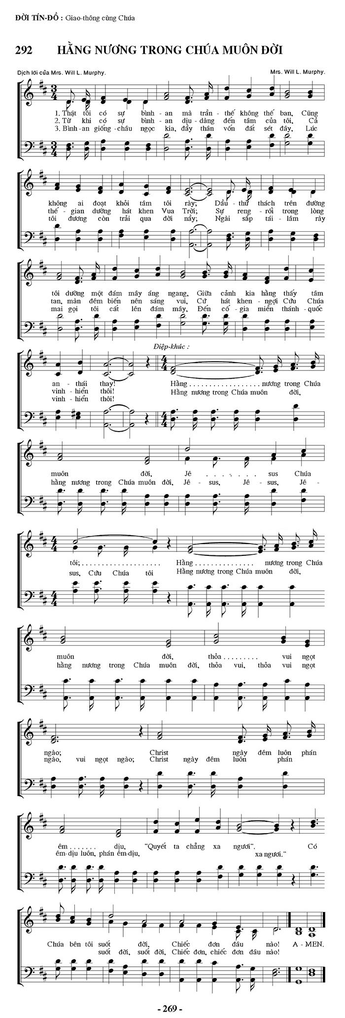1. Thật tôi có sự bình an mà trần thế không thể ban, Cũng không ai đoạt khỏi tâm tôi rày; Dầu thử thách trên đường tôi dưỡng một đám mây áng ngang, Giữa cảnh kia hằng thấy tâm an thái thay! 2. Từ khi có sự bình an dịu dàng đến tâm của tôi, Cả thế gian dường hát khen Vua Trời; Sự reng rối trong lòng tan, màn đêm biến nên sáng vui, Cứ hát khen ngợi Cứu Chúa vinh hiển thôi! 3. Bình an giống châu ngọc kia, đầy thân vốn đất sét đây, Lúc tôi đương còn trải qua đời nầy; Ngài sắp tái lâm rày mai gọi tôi cất lên đám mây, Đến cố gia miền thánh - quốc vinh hiển thôi! Điệp khúc: Hằng nương trong Chúa muôn đời, Hằng nương trong Chúa muôn đời, Jê-sus, Jê-sus Chúa tôi; Hằng nương trong Chúa muôn đời, thỏa vui, thỏa vui ngọt ngào; Christ ngày đêm luôn phán êm dịu, "Quyết ta chẳng xa ngươi". Có Chúa bên tôi suốt đời, Chiếc đơn đâu nào! Outro: A-MEN.