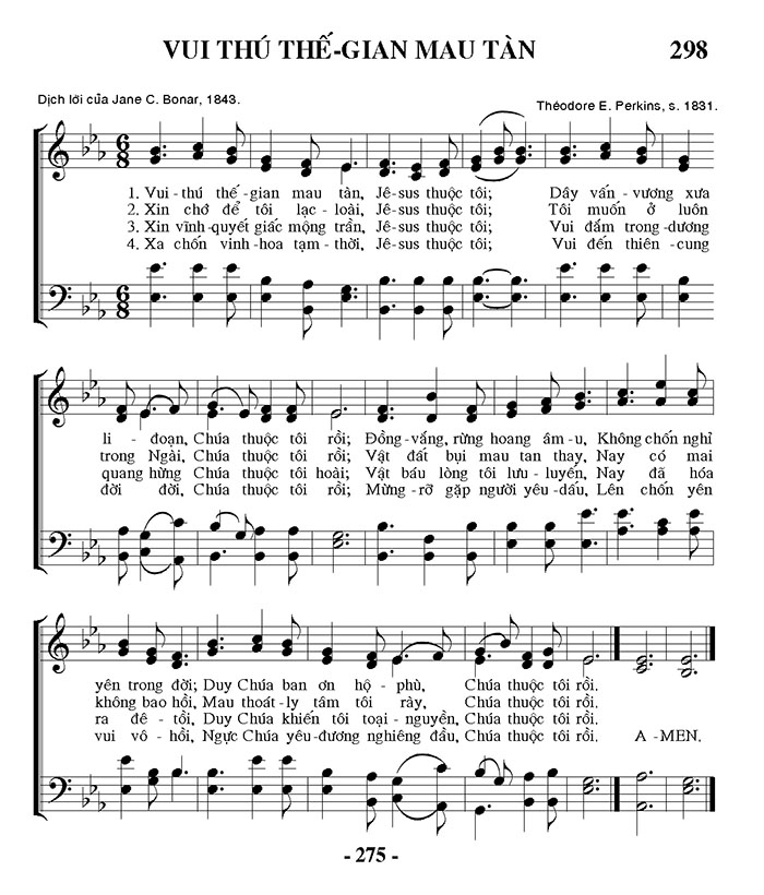 1. Vui - thú thế gian mau tàn, Jê-sus thuộc tôi; Dây vấn - vương xưa li - đoạn, Chúa thuộc tôi rồi; Đồng - vắng, rừng hoang âm u, Không chốn nghỉ yên trong đời; Duy Chúa ban ơn hộ - phù, Chúa thuộc tôi rồi. 2. Xin chở để tôi lạc loài, Jê-sus thuộc tôi; Tôi muốn ở luôn trong Ngài, Chúa thuộc tôi rồi; Vật đất bụi mau tan thay, Nay có mai không bao hồi, Mau thoát - ly tâm tôi rày, Chúa thuộc tôi rồi. 3. Xin vĩnh quyết giấc mộng trần, Jê-sus thuộc tôi; Vui đắm trong dương quang hừng Chúa thuộc tôi hoài; Vật báu lòng tôi lưu - luyến, Nay đã hóa ra đê - tôi, Duy Chúa khiến tôi toại - nguyện, Chúa thuộc tôi rồi. 4. Xa chốn vinh hoa tạm thời, Jê-sus thuộc tôi; Vui đến thiên - cung đời đời, Chúa thuộc tôi rồi; Mừng - rỡ gặp người yêu dấu, Lên chốn yên vui vô - hồi, Ngực Chúa yêu đương nghiêng đầu, Chúa thuộc tôi rồi. Outro: A -MEN.