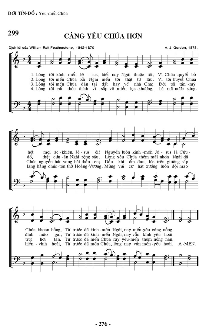 1. Lòng tôi kính - mến Jê - sus, biết nay Ngài thuộc tôi; Vì Chúa quyết bỏ hết mọi ác - khiên, Jê-sus ôi! Nguyền luôn kính - mến Jê - sus là Cứu - Chúa khoan hồng, Từ trước đã kính - mến Ngài, nay mến yêu càng nồng. 2. Lòng tôi mến Chúa bởi Ngài mến tôi thật từ lâu; Vì tôi huyết Chúa đổ, thật cứu -ân Ngài rộng sâu; Lòng yêu Chúa thêm mãi nhơn Ngài đã đính mão gai; Từ trước đã kính - mến Ngài, nay vẫn kính yêu hoài. 3. Lòng tôi mến Chúa dẫu tại đất hay về nhà Cha; Đời tôi tán mỹ Chúa nguyễn hát vang bài thần - ca; Dầu khi ốm đau, lúc trên giường sắp trút hơi tàn, Từ trước đã mến Chúa rày yêu mến thêm nồng nàn. 4. Lòng tôi rất thỏa thích vì sắp vô miền lạc - khương, Là nơi nước sáng - láng hằng chúc - tôn thờ Hoàng -Vương; Mừng vui cứ hát xướng luôn đội mão hiển - vinh hoài, Từ trước đã mến Chúa, lòng nay vẫn mến yêu hoài. Outro: A-MEN.