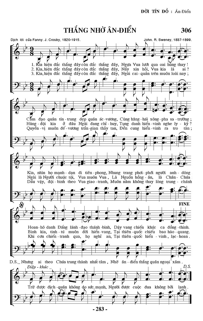 1. Kìa hiện đắc thắng đây còn đắc thắng đây, Ngựa Vua lướt qua oai hùng thay! Cẩm đạo quân tín - trung dẹp quân ác -vương, Cùng hăng hái xông pha sa - trường; Kìa, nhìn họ mạnh - dạn đi tiên phong, Nhung trang phơi phới người anh - dõng Hoan hô danh Đấng lãnh đạo thánh binh, Dậy vang chiến khúc ca đồng thinh. 2. Kìa, hiện đắc thắng đây còn đắc thắng đây, Nầy xin hỏi, Vua kia là ai ? Hùng - đội kia ở đâu Ngài đang chỉ - huy, Tụng danh hiển vinh nghe ly kỳ? Ngài là Người chuộc tội, Vua muôn Vua, Là Nguồn hồng ân, là Chân - Chúa Binh kia, tinh - tú muôn đời hiển vang, Tại thiên quốc chiếu bao hào - quang. 3. Kìa, hiện đắc thắng đây còn đắc thắng đây, Ngài cai quản trên muôn loài nay; Quyền - vị muôn đế - vương trần gian thảy tan, Đền cung hiển vinh ra tro tàn; Dầu vậy, đội - binh theo Vua giao tranh, Muôn năm không thay lòng trung - chánh Khi cơn chiến tranh qua, họ nghỉ an, Tại thiên - quốc hiển vinh, lạc - hoan. Điệp khúc: Nhưng ai theo Chúa trung thành nhất tâm, Nhờ ân - điển thắng quân ngoại xâm. Trừ được địch quân không do sức mạnh, Người được cuộc đua không bởi lạnh.