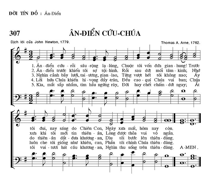 1. Ân - điển cứu - rỗi sâu rộng lạ - lùng, Chuộc tôi vốn đứa gian - hung! Trước tôi đui, nay sáng do Chiên Con, Ngày xưa mất, hôm nay còn. 2. Ân - điển trước khiến tôi sợ tội - hình. Rồi sau dứt mối tâm - kinh; Nhớ xưa khi tôi mới tin thiên - ân, Lòng được thỏa vui vô ngần. 3. Nghìn cảnh bẫy lưới, tai - ương, gian - lao, Từng vượt hết tôi không nao; Ay do thiên - ân dắt - đưa khương - an, Dìu tôi bước lên thiên - đàng. 4. Lời hứa Chúa khiến hi - vọng đầy tràn, Đều cao - quí Chúa vui ban; Chúa luôn che tôi giống như khiên, can, Phần tôi chính Chúa thiên - đàng. 5. Kìa, mắt sắp nhắm, tim hầu ngừng rày, Đời hay chết chấm - dứt ngay; At tôi vui - tươi hát câu khương - an, Nghìn thu sống trên thiên - đàng. A-MEN.