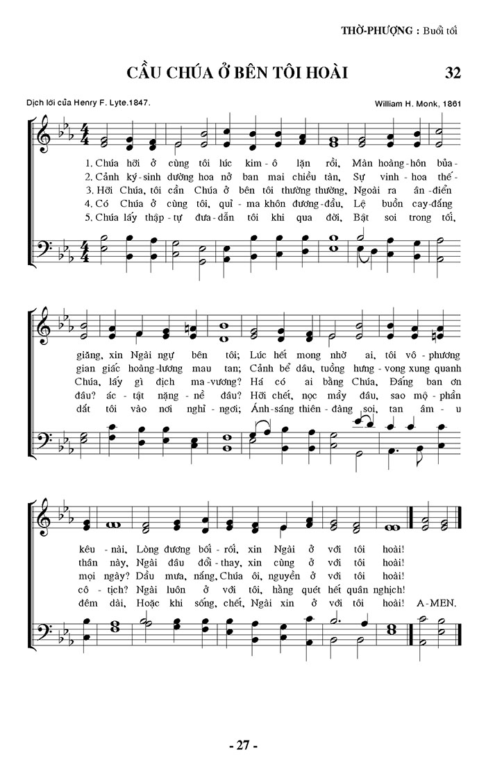 1. Chúa hỡi ở cùng tôi lúc kim ô lặn rồi, Màn hoàng hôn bủa giăng, xin Ngài ngự bên tôi; Lúc hết mong nhờ ai, tôi vô phương kêu nài, Lòng đương bối rối, xin Ngài ở với tôi hoài! 2. Cảnh ký-sinh dường hoa nở ban mai chiều tàn, Sự vinh hoa thế gian giấc hoàng-lương mau tan; Cảnh bể dâu, tuồng hư vong xung quanh thân này, Ngài đâu đổi thay, xin cùng ở với tôi hoài! 3. Hỡi Chúa, tôi cần Chúa ở bên tôi thường thường, Ngoài ra ân-điển Chúa, lấy gì địch ma-vương? Há có ai bằng Chúa, Đấng ban ơn mọi ngày? Dầu mưa, nắng, Chúa ôi, nguyền ở với tôi hoài! 4. Có Chúa ở cùng tôi, quỉ-ma khôn đương-đầu, Lệ buồn cay đắng đâu? ác tật nặng-nề đâu? Hỡi chết, nọc mầy đâu, sao mộ-phần cô tịch? Ngài luôn ở với tôi, hằng quét hết quân nghịch! 5. Chúa lấy thập-tự đưa-dẫn tôi khi qua đời, Bật soi trong tối, dắt tôi vào nơi nghỉ-ngơi; Ánh sáng thiên-đàng soi, tan âm u đêm dài, Hoặc khi sống, chết, Ngài xin ở với tôi hoài! A-MEN.