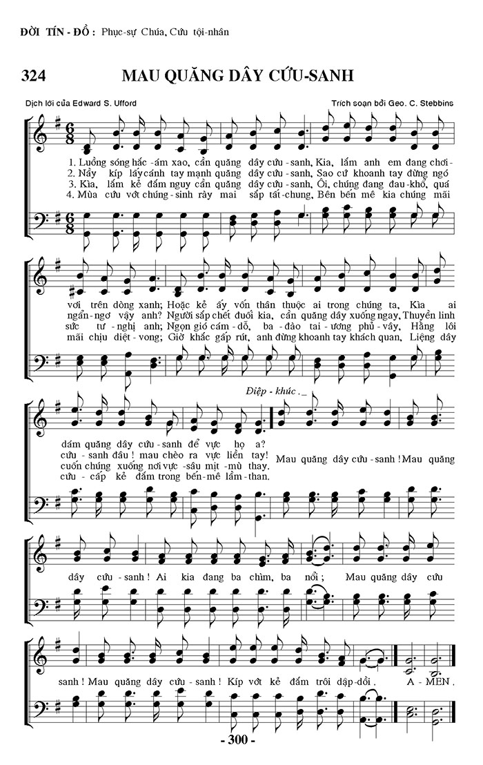 1. Luồng sóng hắc ám xao, cần quăng dây cứu - sanh, Kia, lắm anh em đang chơi - với trên dòng xanh; Hoặc kẻ ấy vốn thân thuộc ai trong chúng ta, Kìa ai dám quăng dây cứu - sanh để vực họ a? 2. Nầy kíp lấy cánh tay mạnh quăng dây cứu - sanh, Sao cứ khoanh tay đừng ngó ngẩn ngơ vậy anh? Người sắp chết đuối kia, cần quăng dây xuống ngay, Thuyền linh cứu - sanh đâu! mau chèo ra vực liền tay! 3. Kìa, lắm kẻ đắm nguy cần quăng dây cứu - sanh, Ôi, chúng đang đau khổ, quá sức tư - nghị anh; Ngọn gió cám - dỗ, ba đào tai ương phủ - vây, Hằng lôi cuốn chúng xuống nơi vực - sâu mịt - mù thay. 4. Mùa cứu vớt chúng - sinh rày mai sắp tất chung, Bên bến mê kia chúng mãi mãi chịu diệt - vong; Giờ khắc gấp rút, anh đừng khoanh tay khách quan, Liệng dây cứu - cấp kẻ đắm trong bến mê lầm than. Điệp khúc: Mau quăng dây cứu - sanh! Mau quăng dây cứu - sanh! Ai kia đang ba chìm, ba nổi; Mau quăng dây cứu sanh! Mau quăng dây cứu - sanh! Kíp vớt kẻ đắm trôi dập dồi. A - MEN.