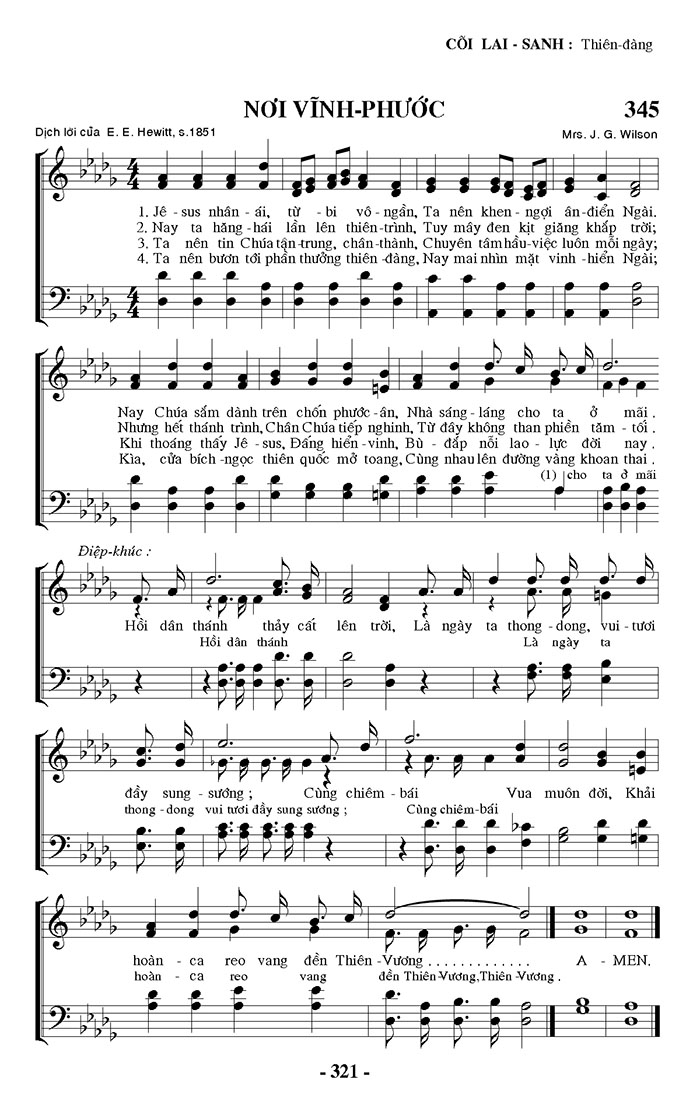 1. Jê-sus nhân ái, từ bị vô-ngần, Ta nên khen ngợi ân điển Ngài. Nay Chúa sắm dành trên chốn phước-ân, Nhà sáng-láng cho ta ở mãi. 2. Nay ta hăng-hái lần lên thiên trình, Tuy mây đen kịt giăng khắp trời; Nhưng hết thánh trình, Chân Chúa tiếp nghinh, Từ đây không than phiền tăm tối. 3. Ta nên tin Chúa tận trung, chân thành, Chuyên tâm hầu-việc luôn mỗi ngày; Khi thoáng thấy Jê-sus, Đấng hiển-vinh, Bù đắp nỗi lao-lực đời nay. 4. Ta nên bươn tới phần thưởng thiên đàng, Nay mai nhìn mặt vinh-hiển Ngài; Kìa, cửa bích-ngọc thiên quốc mở toang, Cùng nhau lên đường vàng khoan thai. Điệp khúc: Hồi dân thánh thảy cất lên trời, Là ngày ta thong-dong, vui-tươi đầy sung-sướng; Cùng chiêm-bái Vua muôn đời, Khải hoàn ca reo vang đền Thiên-Vương. Hồi dân thánh là ngày ta thong-dong vui tươi đầy sung-sướng; Cùng chiêm-bái Vua muôn đời, Khải hoàn ca reo vang đền Thiên-Vương, Thiên-Vương. A-MEN.