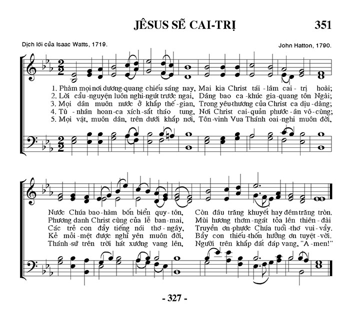 1. Phàm mọi nơi dương-quang chiếu sáng nay, Mai kia Christ tái - lâm cai - trị hoài; Nước Chúa bao-hàm bốn biển quy - tôn, Còn đâu trăng khuyết hay đêm trăng tròn. 2. Lời cầu -nguyện luôn nghi-ngút trước ngai, Dâng bao ca -khúc gia-quang tôn Ngài, Phương danh Christ cùng của lễ ban-mai, Mùi hương thơm-ngát tỏa lên thiên - đài 3. Mọi dân muôn nước ở khắp thế -gian, Trong yêu-thương của Christ ca dịu-dàng; Các trẻ con đầy tiếng nói thơ - ngây, Truyền ơn -phước Chúa tuổi thơ vui - vầy. 4. Tù - nhân hoan-ca xích-sắt tháo tung, Nơi Christ cai-quản phước - ân vô-cùng; Kẻ mỏi -mệt được nghỉ yên muôn đời, Bầy con thiếu-thốn hưởng ơn tuyệt - vời. 5. Mọi vật, muôn dân, trên dưới khắp nơi, Tôn-vinh Vua Thánh oai-nghi muôn đời, Thánh sứ trên trời hát xướng vang lên, Người trên khắp đất đáp vang, "A -men!"