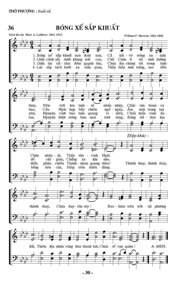 1. Bóng xế sắp khuất non đoài nay, Cả hải võ trông an tinh thay, Đèn trời kia tinh tú nhấp nháy, Chúc tán hoan ca đất, Thiên địa nhân cùng hòa thanh hát, Chúa tể vạn quân! 2. Giữa cảnh sắc dưới khung trời cao, Chỗ Chúa ở tốt tươi dường bao, Cầu Ngài họp bầy chiên ngơ ngáo, Am mãi trong tay đất, Thiên địa nhân cùng hòa thanh hát, Chúa tể vạn quân! 3. Giữa lúc tối tăm đêm quạnh hiu, Chúa ẩm chúng tôi trong tình yêu; Nguyện vượt bao tinh quang vi diệu, Chốn hiển vinh ân đất, Thiên địa nhân cùng hòa thanh hát, Chúa tể vạn quân! 4. Lúc sắp tách bước xa trần gian, Thảy thảy ánh trăng, sao đều tan, Nguyện được trông ban mai tươi sáng, Bóng tối tăm kia đất, Thiên địa nhân cùng hòa thanh hát, Chúa tể vạn quân! Điệp khúc: Chúa nhân ái, Thảy tôn vinh Ngài. để chỉ giáo, Chẳng xa khi nào. điển phản chiếu Thánh nhan quang diệu! bỗng tiêu tán, Sống trên thiên đàng. Thánh thay, thánh thay, thánh thay, Chúa duy tôn rày! Bao hàm trên trời tột phương A-MEN.