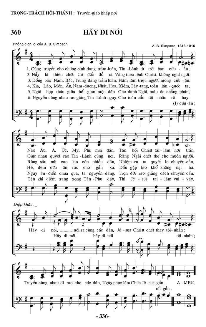 1. Cùng truyền cho chúng sinh đang trầm luân, Tin Lành từ trời ban cứu ân. Nào Âu, Á, Úc, Mỹ, Phi, mọi dân, Tận hồi Christ tái - lâm nơi trần. 2. Nầy là thiên chức Cơ - đốc - đồ ơi, Vâng theo lệnh Christ, không nghỉ ngơi. Giục nhau quyết rao Tin Lành cùng nơi, Rằng Ngài chết thế cho muôn người. 3. Đồng bào Nam, Bắc, Trung đang trầm luân, Hăm lăm triệu người mong cứu - ân. Rừng sâu núi cao kia còn nhiều dân, Nhiệm vụ ta quyết lo chuyên cần, 4. Kìa, Lào, Mên, Ấn, Nam - dương, Nhật, Hoa, Xiêm, Tây tạng, toàn lân quốc ta; Hè, đem cứu ân rao cho gần xa, Dầu gặp lao - khổ không nại hà. 5. Ngài họp thâu giữa thế gian một dân Cho danh Ngài, màu da chẳng phân; Ngày ân - điển chưa qua, ta nguyễn dâng, Trọn đời rao giảng cách chuyên cần, 6. Nguyễn cùng nhau rao giảng Tin - Lành ngay, Cho toàn cầu tội - nhân rõ hay. Tận khi điểm trang xong Tân - Phụ đây, Thì Jê sus tái lâm vui vầy. Điệp khúc: Hãy đi nói, nói ra cùng các dân, Jêsus Christ chết thay tội nhân; Hãy đi nói, hãy đi nói tội nhân ; Truyền cùng nhau đi rao cho các dân, Ngày phục lâm Chúa Jê-sus gần. rất gần. Outro: A-MEN.