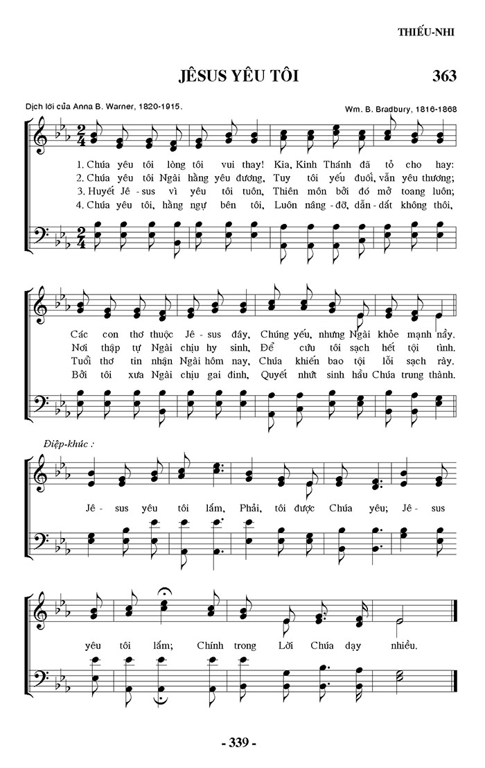1. Chúa yêu tôi lòng tôi vui thay! Kia, Kinh Thánh đã tỏ cho hay: Các con thơ thuộc Jê-sus đây, Chúng yếu, nhưng Ngài khỏe mạnh nầy. 2. Chúa yêu tôi Ngài hằng yêu đương, Tuy tôi yếu đuối, vẫn yêu thương; Nơi thập tự Ngài chịu hy sinh, Để cứu tôi sạch hết tội tình. 3. Huyết Jê-sus vì yêu tôi tuôn, Thiên môn bởi đó mở toang luôn; Tuổi thơ tin nhận Ngài hôm nay, Chúa khiến bao tội lỗi sạch rày. 4. Chúa yêu tôi, hằng ngự bên tôi, Luôn nâng đỡ, dẫn dắt không thôi, Bởi tôi xưa Ngài chịu gai đinh, Quyết nhứt sinh hầu Chúa trung thành. Điệp khúc: Jê-sus yêu tôi lắm, Phải, tôi được Chúa yêu; Jê-sus yêu tôi lắm; Chính trong Lời Chúa dạy nhiều.
